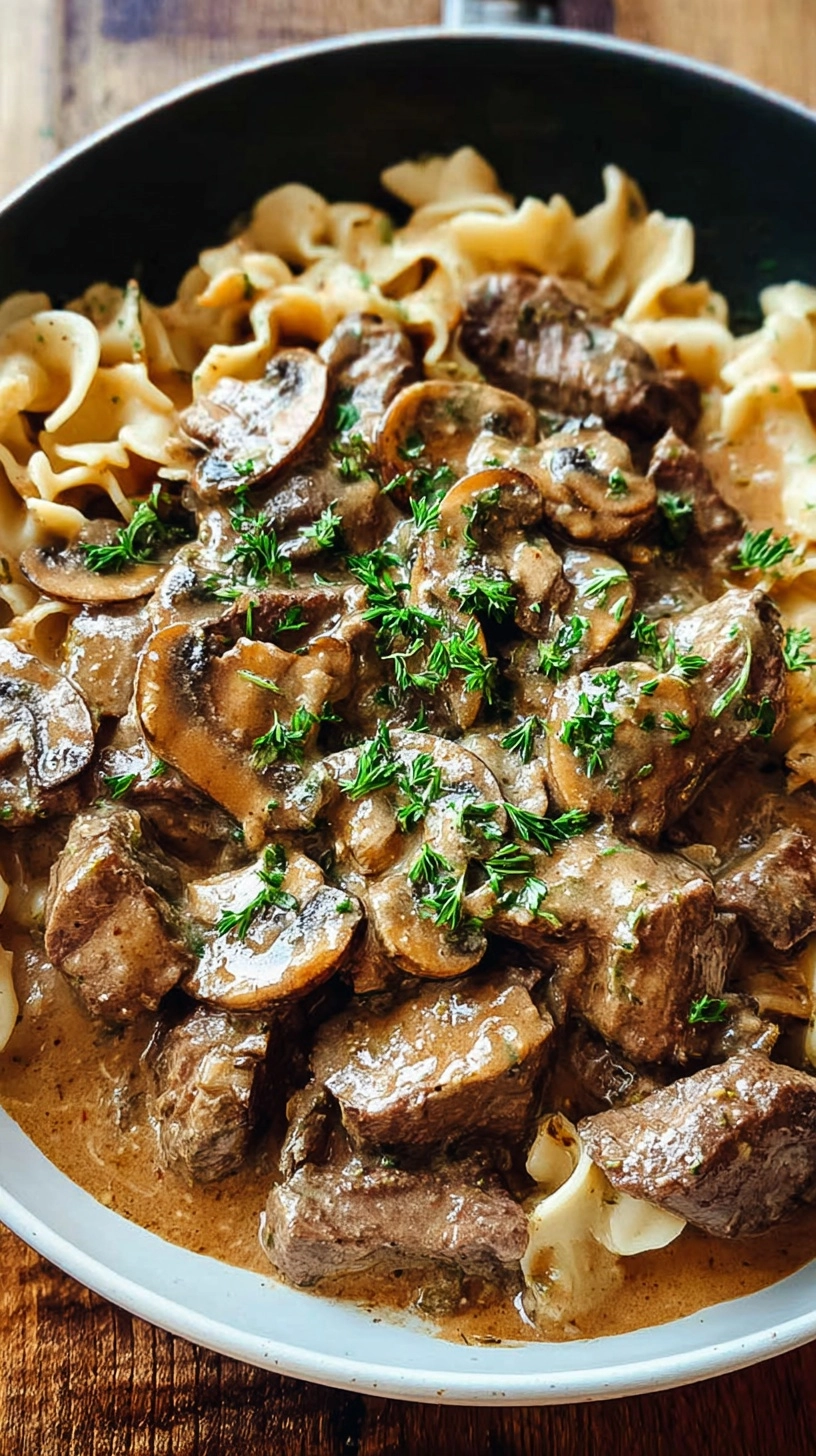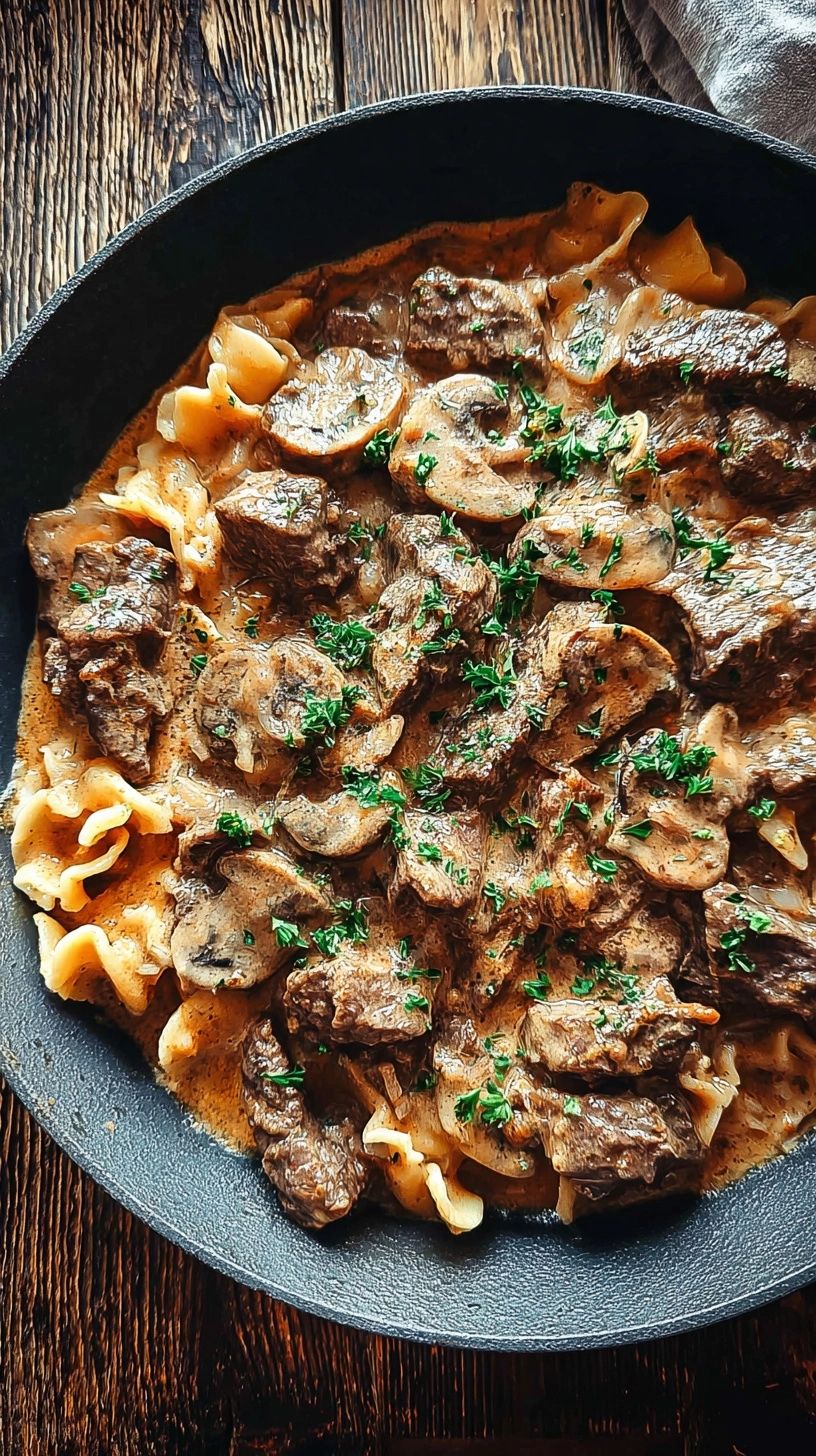 Elevate your beef stroganoff presentation by serving it in individual cast-iron skillets for a rustic, restaurant-style appearance. Garnish with additional fresh dill sprigs and a dollop of sour cream for visual appeal.