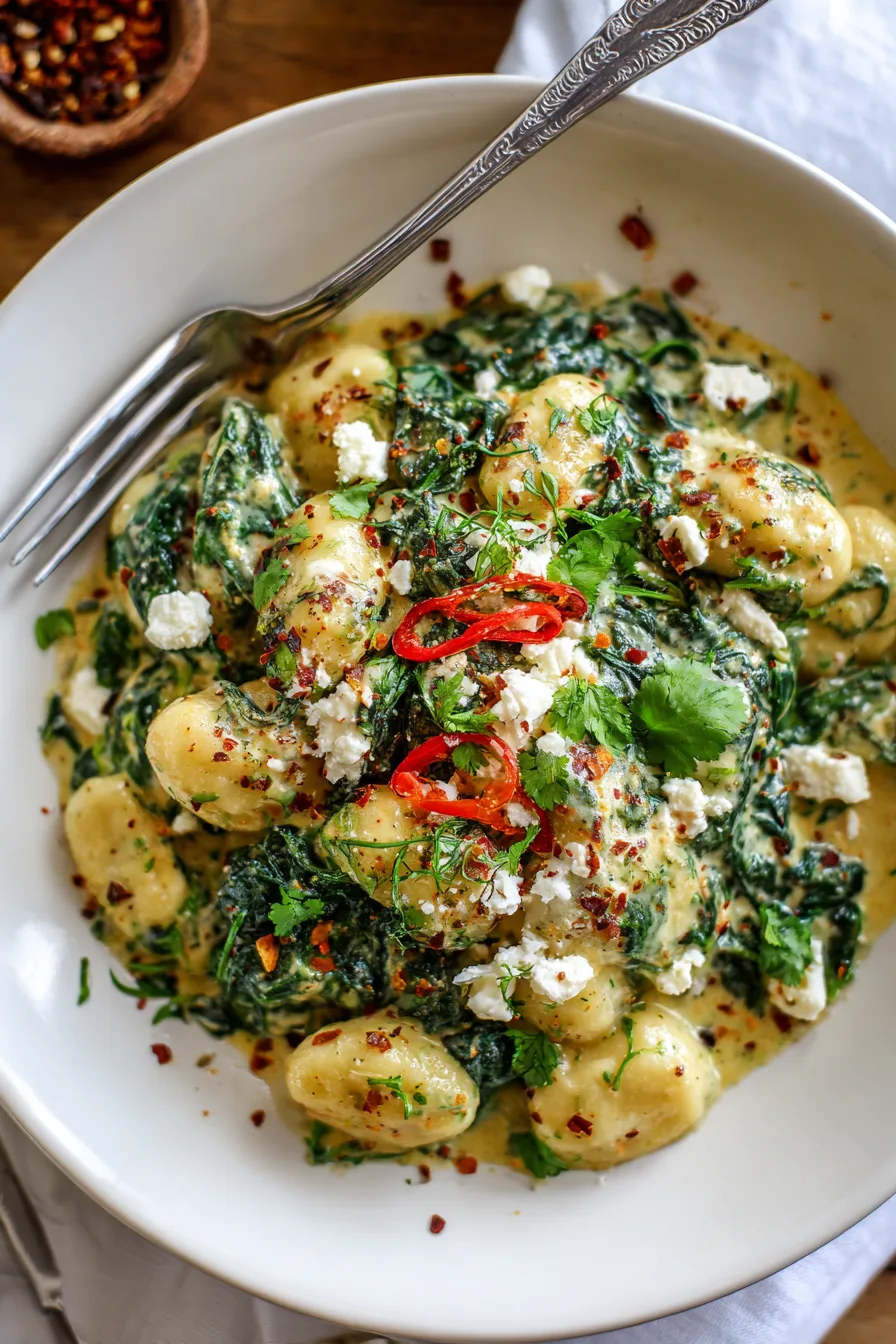 Transform this indulgent dish into a lighter option without sacrificing flavor. Replace heavy cream with a mixture of Greek yogurt and low-sodium vegetable broth for a protein boost and 40% calorie reduction. Substitute traditional gnocchi with sweet potato or chickpea varieties to increase fiber content. For a dairy-free version, use cashew cream and nutritional yeast instead of feta, maintaining the tangy, umami-rich profile. Adding extra vegetables like cherry tomatoes or roasted bell peppers increases antioxidant content while creating beautiful color contrast.