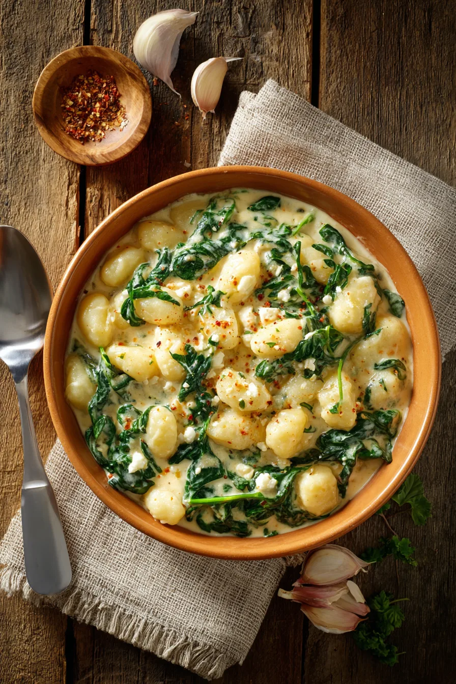 Store leftover Creamy Gnocchi With Spinach and Feta in the refrigerator for up to 3 days in airtight containers. When reheating, add a splash of broth or cream to restore the sauce’s consistency, as dairy-based sauces tend to thicken when chilled. Reheat gently over low heat, stirring frequently to prevent the sauce from breaking. While this dish is best enjoyed fresh, you can prep components ahead by washing and drying spinach, crumbling feta, and mincing garlic up to 2 days in advance.