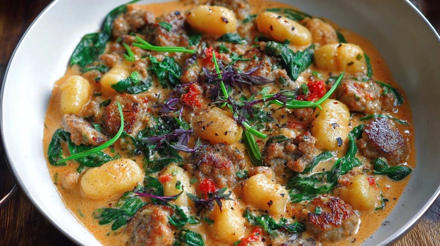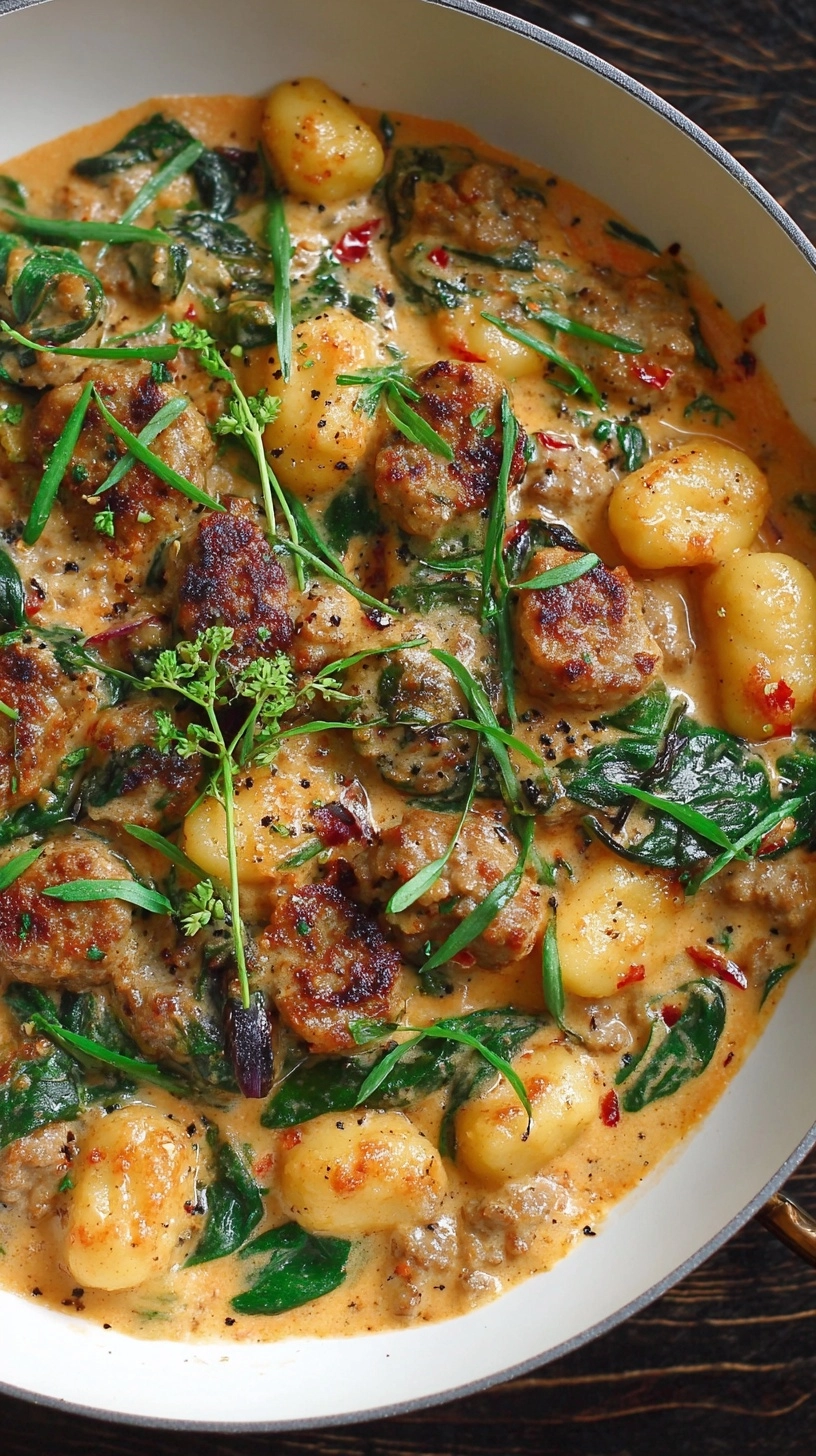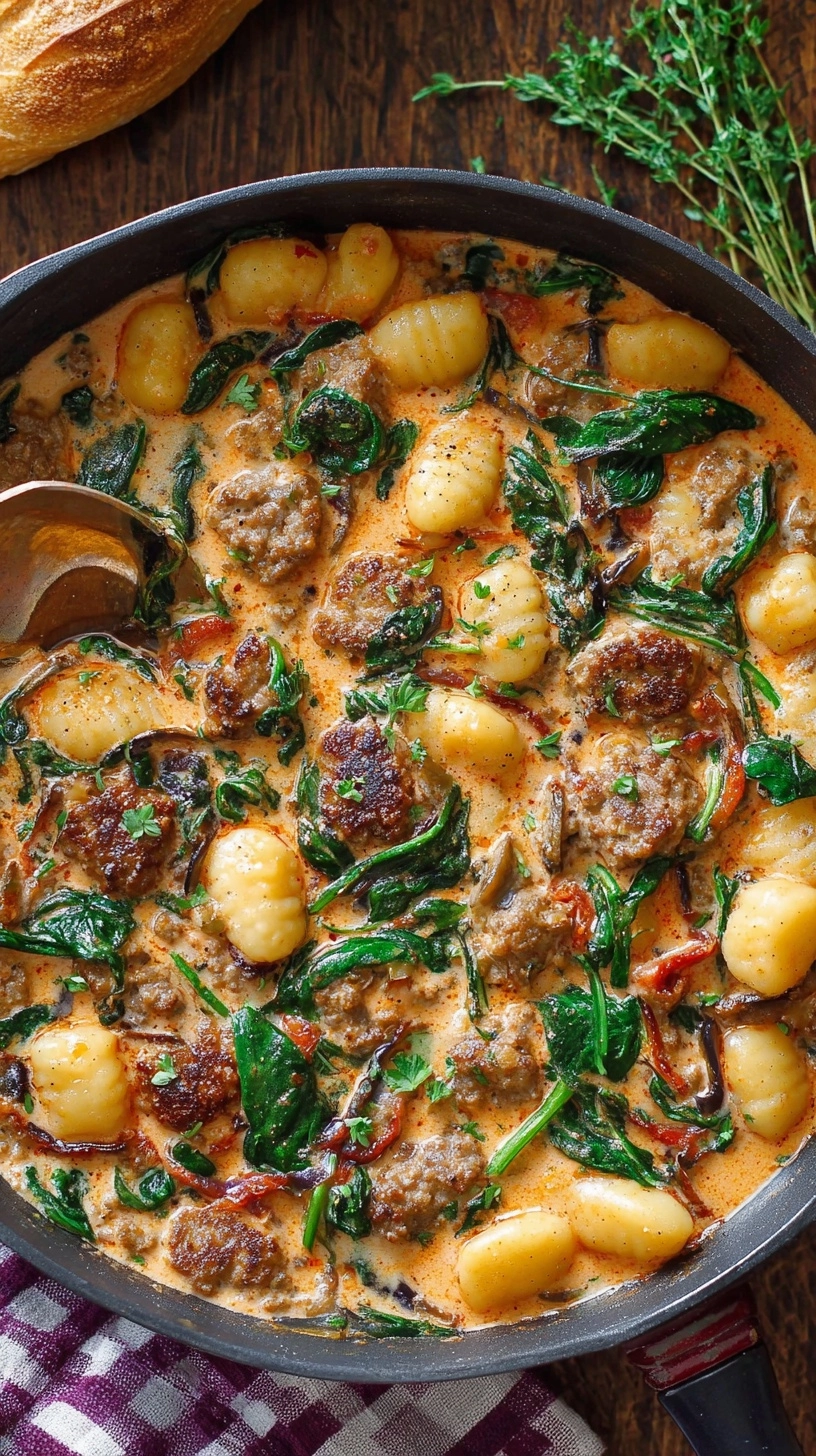 Never add cream to a rapidly boiling sauce—it will curdle immediately. Always temper by reducing heat first. Overcooking gnocchi creates a mushy texture; they should retain slight firmness. Don’t skip browning the sausage properly—this step provides 60% of the dish’s flavor complexity. Avoid overcrowding the pan, which creates steam instead of the desired caramelization. Finally, add spinach at the very end; overcooking turns it bitter and destroys its vibrant color.