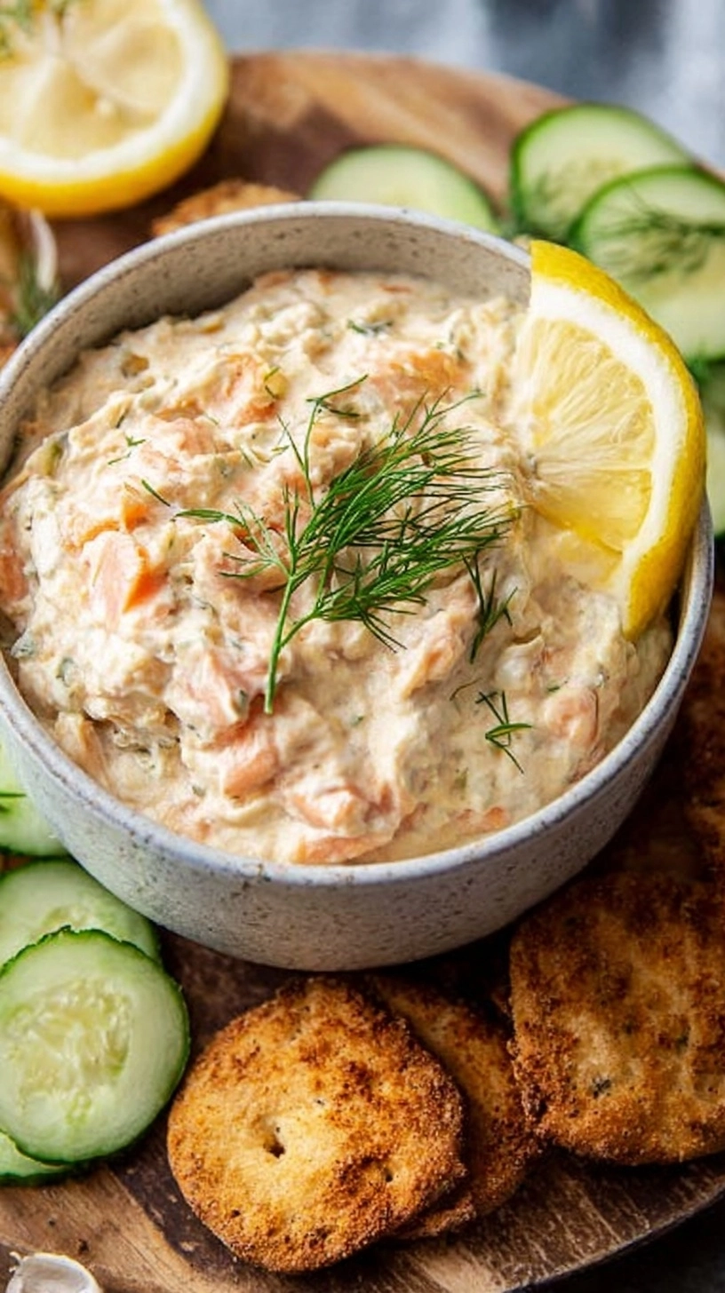 Present your Creamy Smoked Salmon Dip with Fresh Lemon in a chilled glass bowl surrounded by colorful accompaniments. Toasted pumpernickel rounds provide earthy contrast, while cucumber slices offer refreshing crunch that complements the rich salmon flavors.