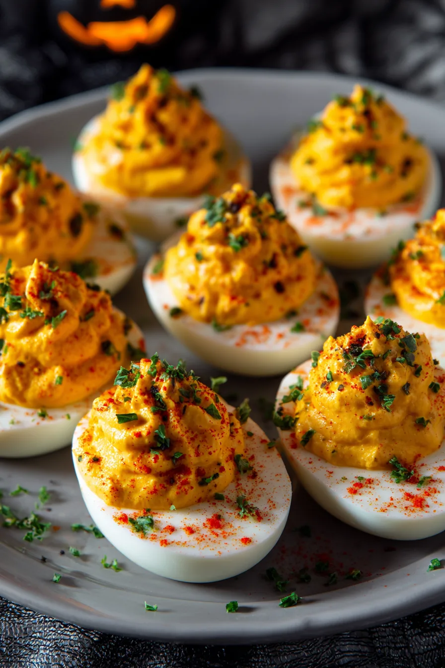 Present your creepy deviled eggs on a black slate board surrounded by dry ice (in a separate container) for dramatic fog effects. Arrange them in a graveyard pattern with pretzel stick “tombstones” labeled with spooky epitaphs.