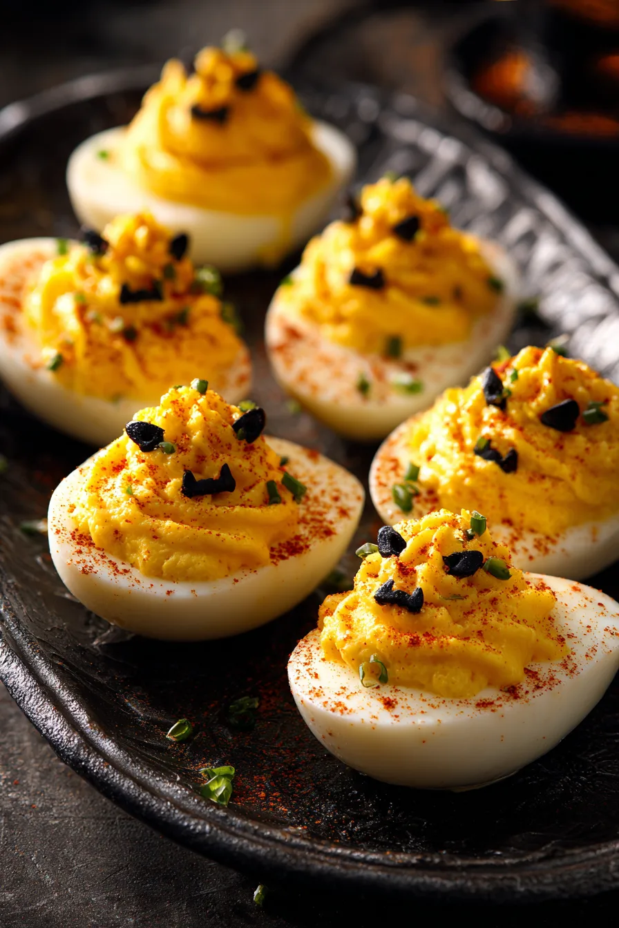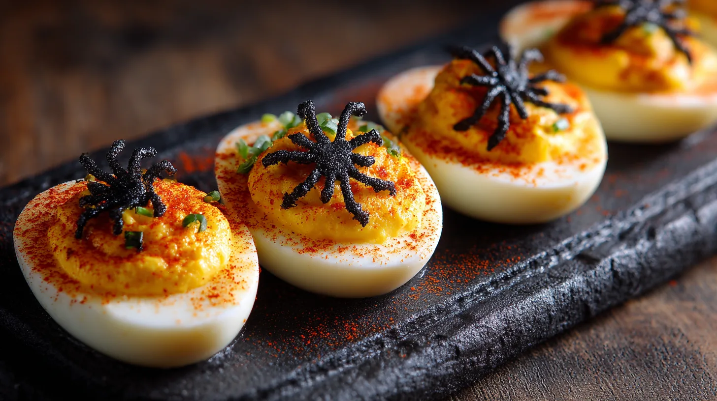 For spider eggs: top black-filled eggs with halved black olives and insert chive “legs.” For bloody effects: sprinkle paprika and add red pepper “blood drops.” Each egg should tell its own spooky story.