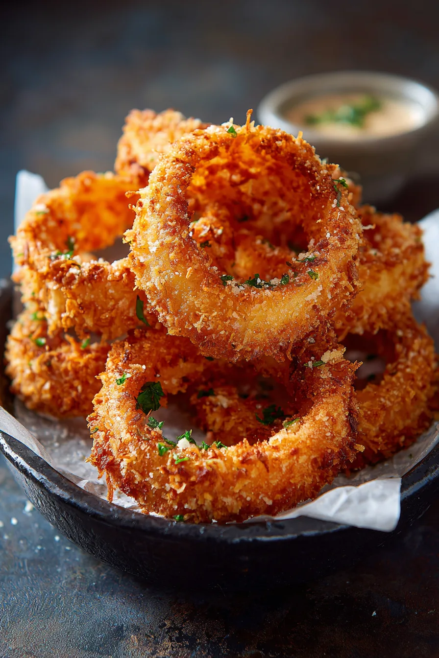 Dredge each onion ring first in flour, shaking off excess, then dip in egg wash, and finally coat generously in the Parmesan mixture. Press coating gently to ensure adherence—this step is crucial for achieving restaurant-quality crispiness.