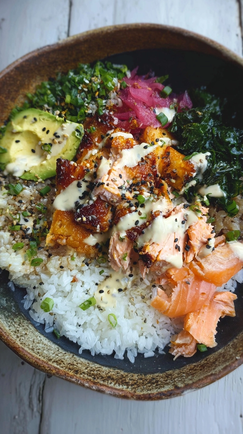 Elevate your Crispy Salmon & Rice Bowl experience by serving in pre-warmed bowls to maintain optimal temperature. Consider family-style presentation with deconstructed components, allowing diners to customize their perfect bite ratio. Pair with refreshing cucumber water infused with mint, or serve alongside miso soup for a complete Japanese-inspired meal. For entertaining, prepare ingredients in advance and offer a DIY bowl bar with multiple sauce options.