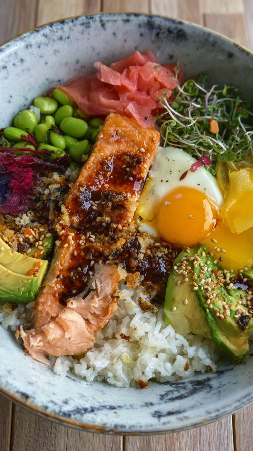 Divide warm seasoned rice among four bowls, creating a foundation base. Flake the crispy salmon into generous portions, ensuring each serving includes crispy skin pieces. Artfully arrange avocado slices, cucumber matchsticks, shredded carrots, and fresh spinach around the salmon. Drizzle with umami sauce and garnish with sesame seeds, pickled ginger, and sliced green onions.