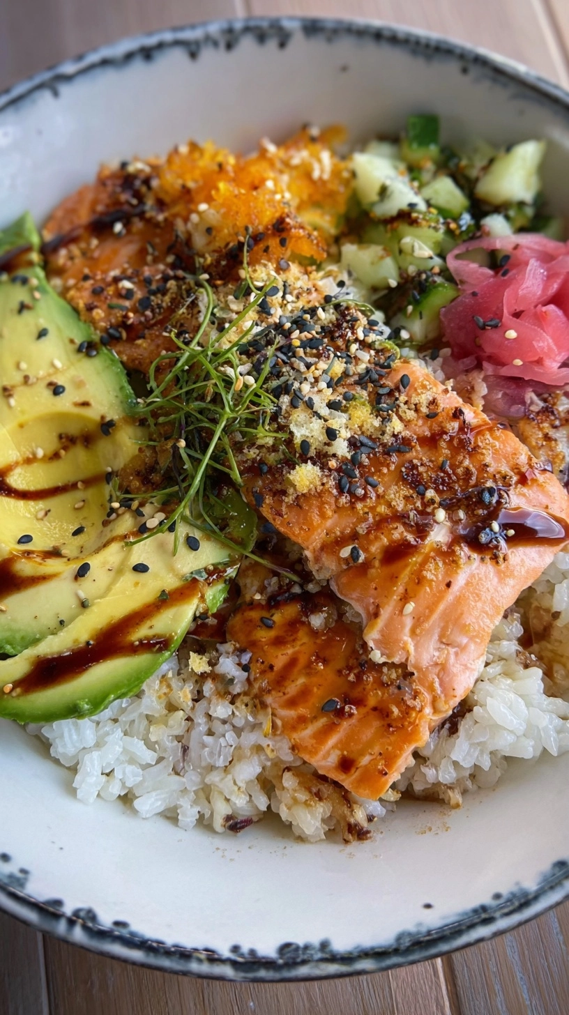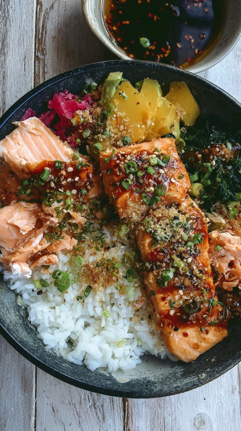 Elevate your Crispy Salmon & Rice Bowl with creative garnishes: toasted nori sheets for umami depth, pickled ginger for palate cleansing, or edamame for extra protein. Serve alongside miso soup for an authentic Japanese-inspired meal, or pair with refreshing cucumber mint water. For entertaining, create a build-your-own bowl station with various toppings and sauces, allowing guests to customize their perfect combination.
