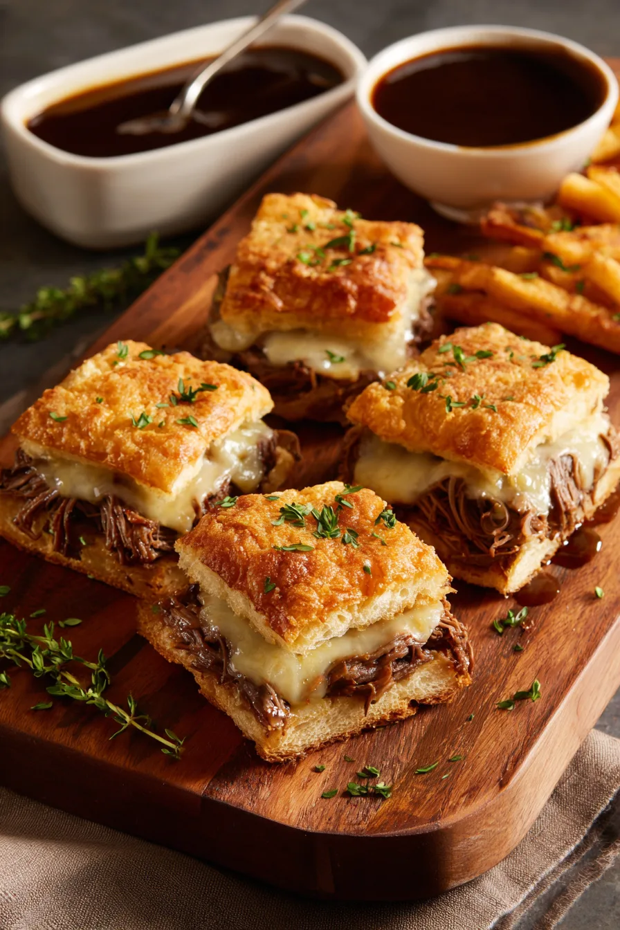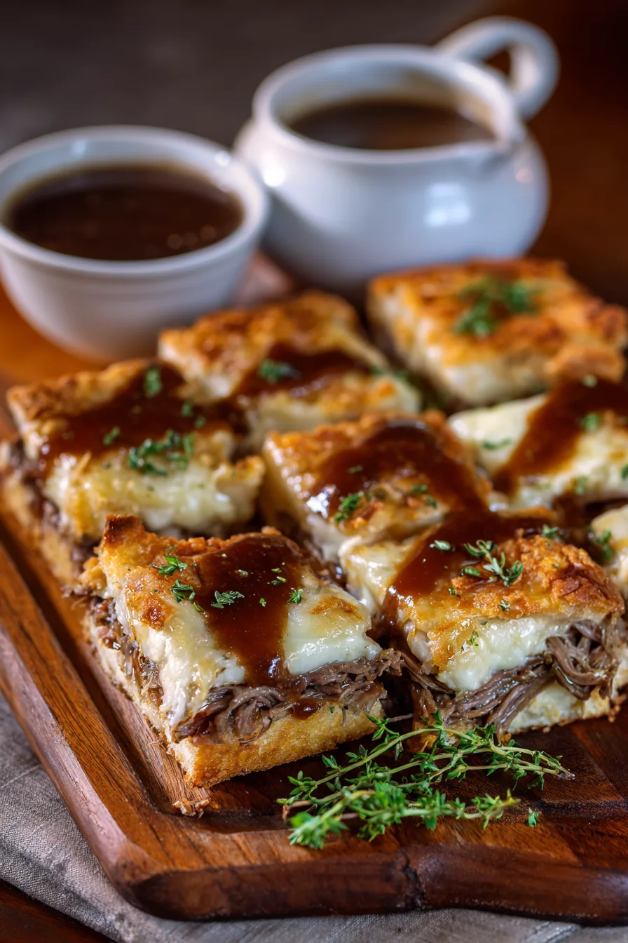 Transform your French dip squares into a complete dining experience by pairing them with crispy sweet potato fries or a fresh arugula salad with balsamic vinaigrette. For entertaining, cut into smaller appetizer-sized portions and serve alongside the warm au jus in small ramekins.