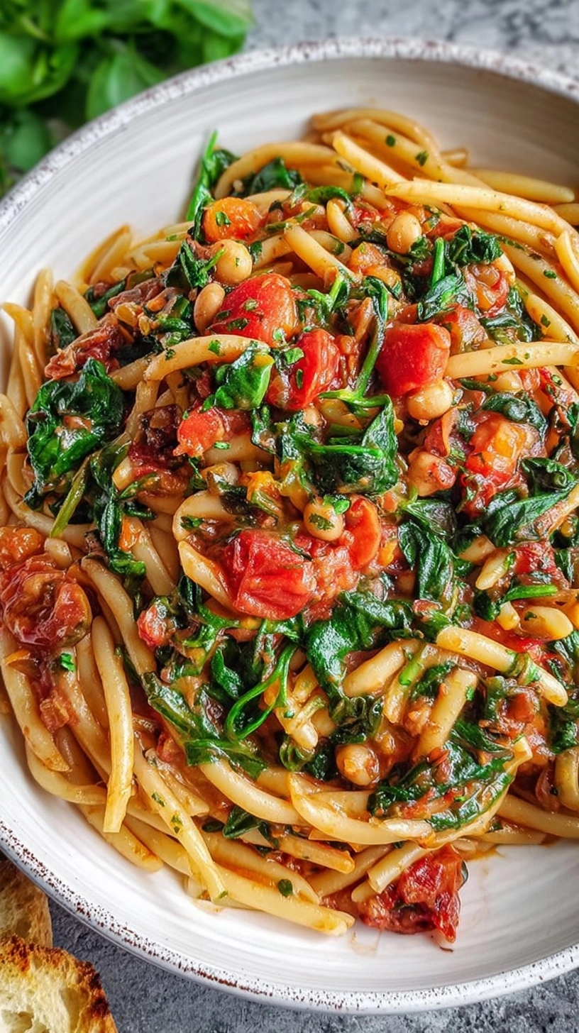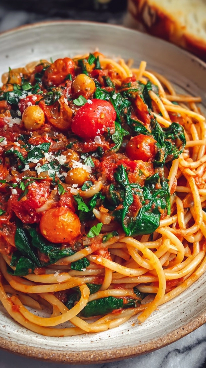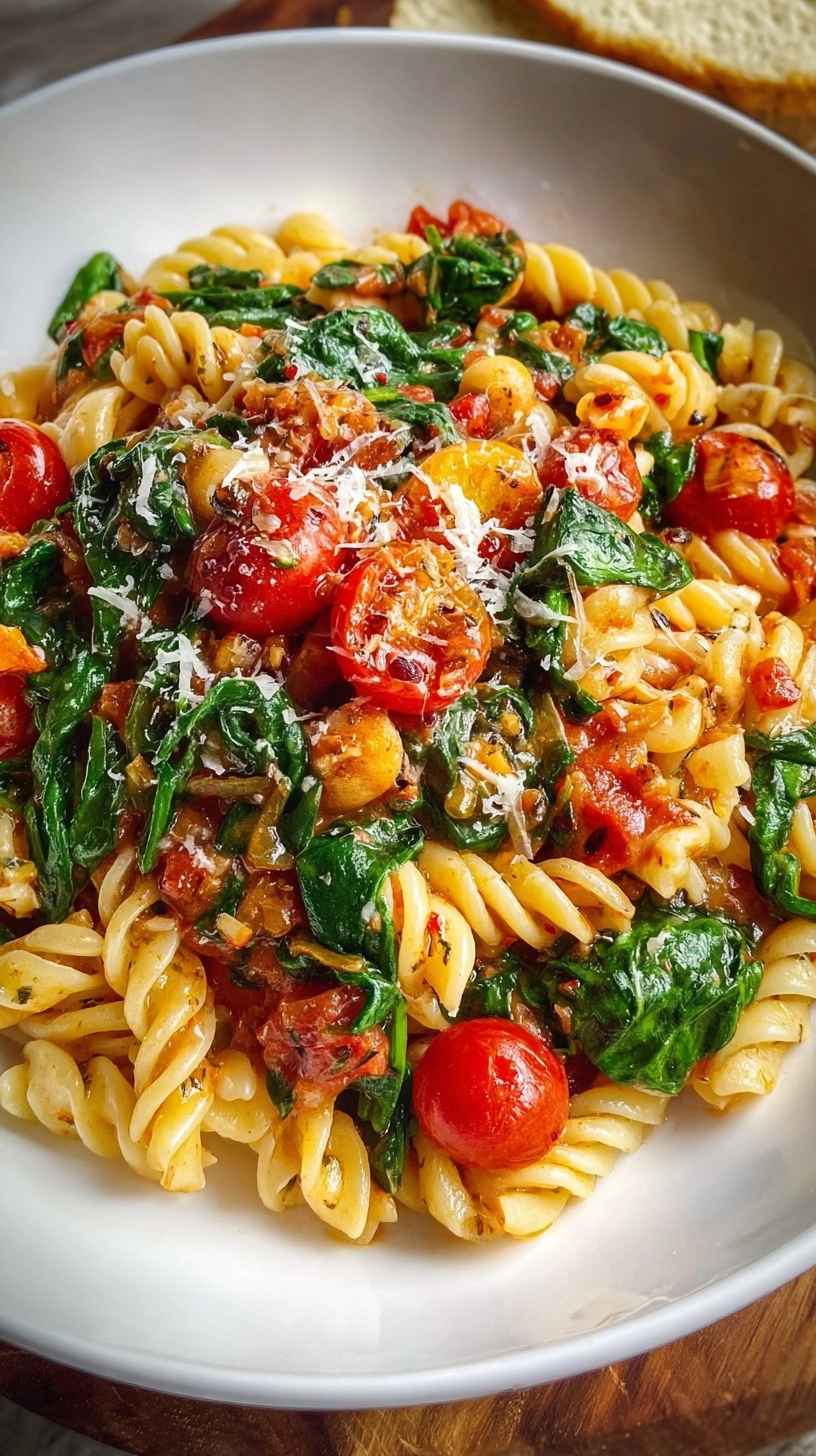 Substitution Options: Gluten-free pasta works perfectly, while vegan Parmesan can replace dairy cheese. Frozen spinach (1 cup, thawed and drained) substitutes for fresh, and sun-dried tomatoes add intense flavor when fresh tomatoes aren’t available.