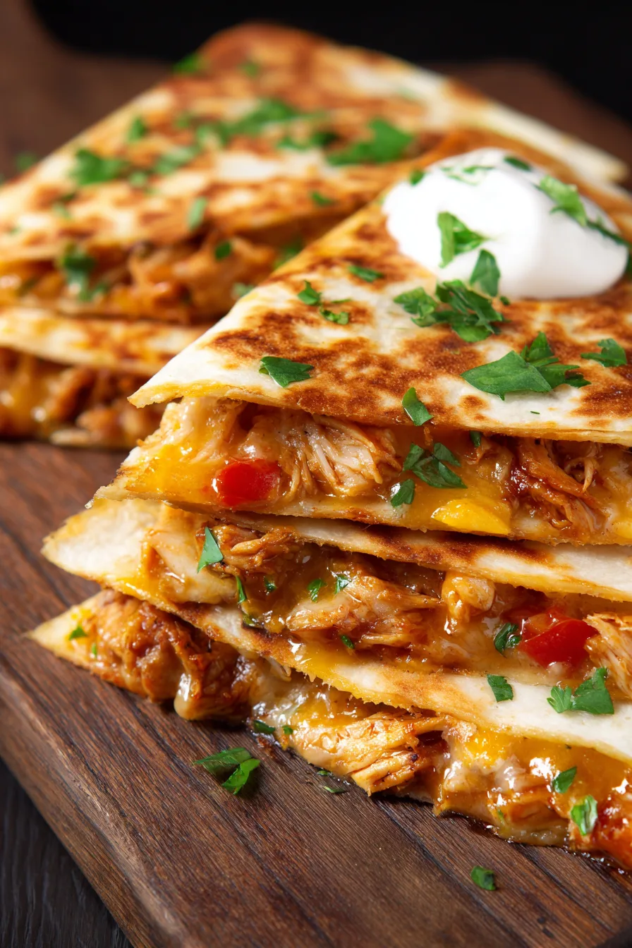 Serve BBQ chicken quesadillas with fresh guacamole, salsa verde, and Mexican crema for a complete flavor experience. A simple side salad with lime vinaigrette balances the richness perfectly. For parties, cut quesadillas into smaller triangles and arrange on platters with colorful bell pepper strips.