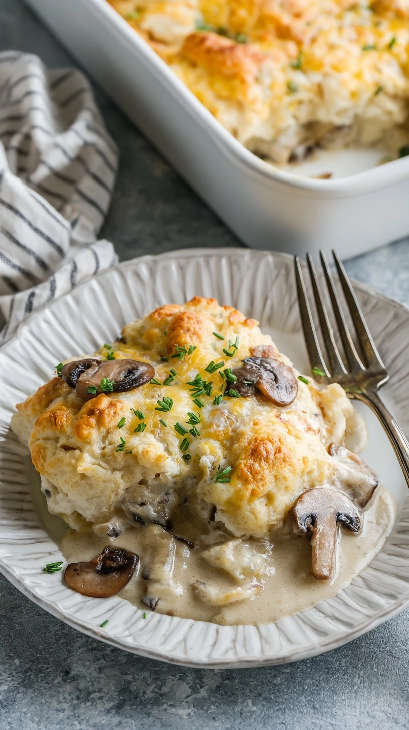 Preheat your oven to 350°F and generously grease a 9×13-inch baking dish. Cut the biscuits into quarters and arrange them evenly across the bottom of the dish. Brush with melted butter to ensure golden, crispy edges that won’t become soggy under the gravy layer.