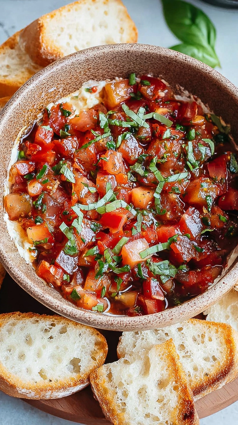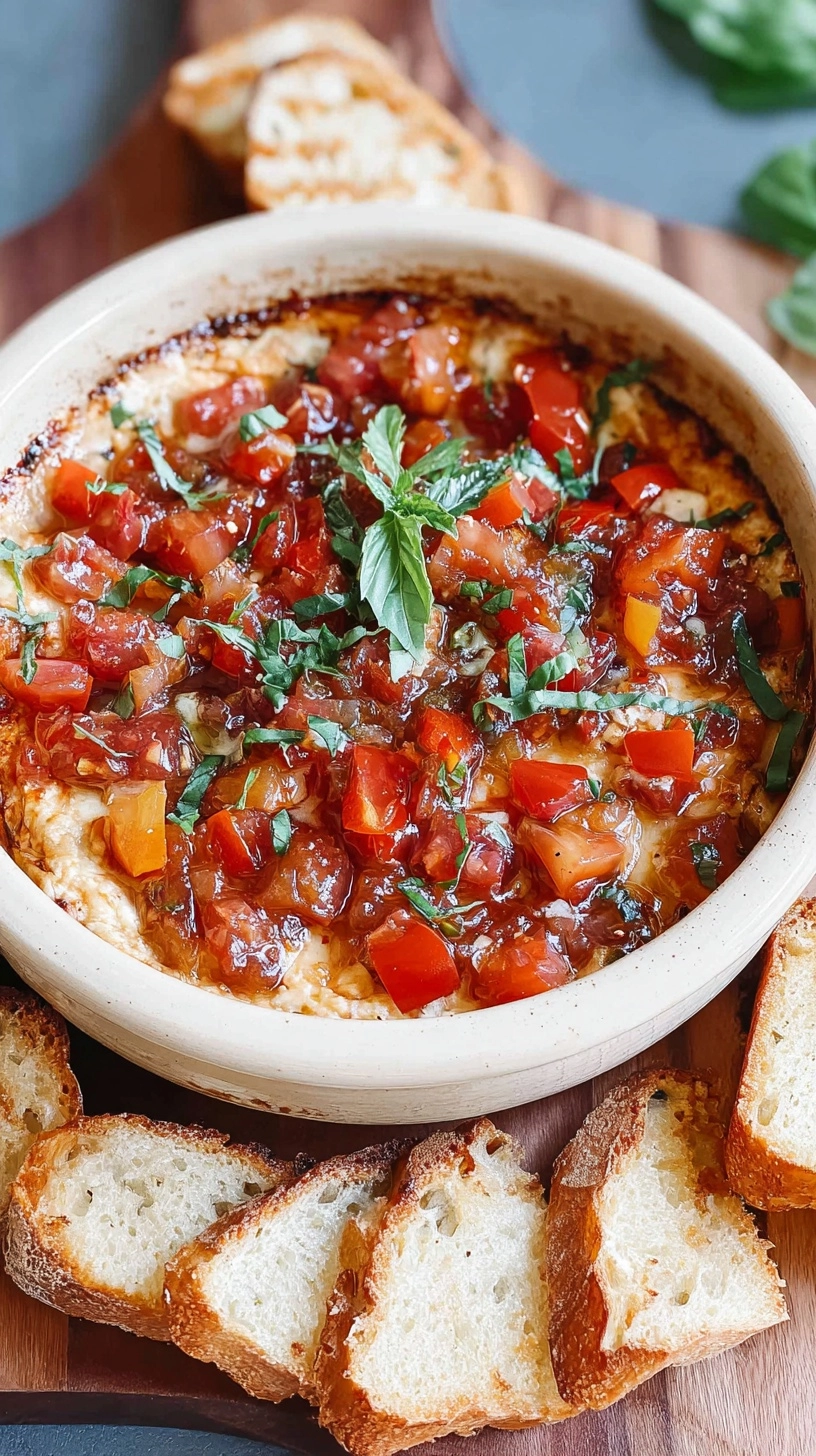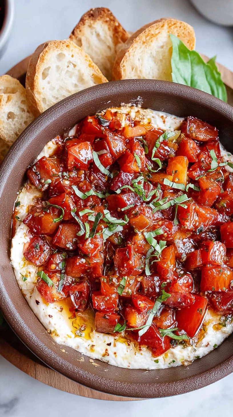 Present your bruschetta dip in a beautiful ceramic bowl, surrounded by an artful array of dippers that cater to diverse preferences. Toasted baguette rounds provide classic authenticity, while colorful bell pepper strips offer a fresh, low-carb option. Pita chips deliver satisfying crunch, and endive leaves create elegant, boat-like vessels for sophisticated presentations.