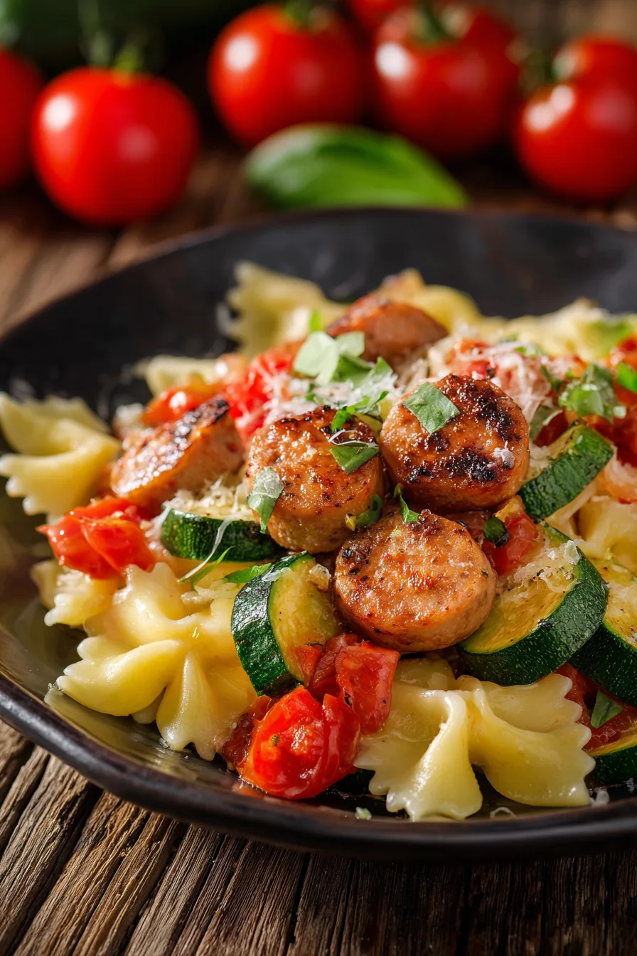 Transform this chicken sausages with zucchini tomatoes and pasta into a restaurant-quality experience with these creative presentations: