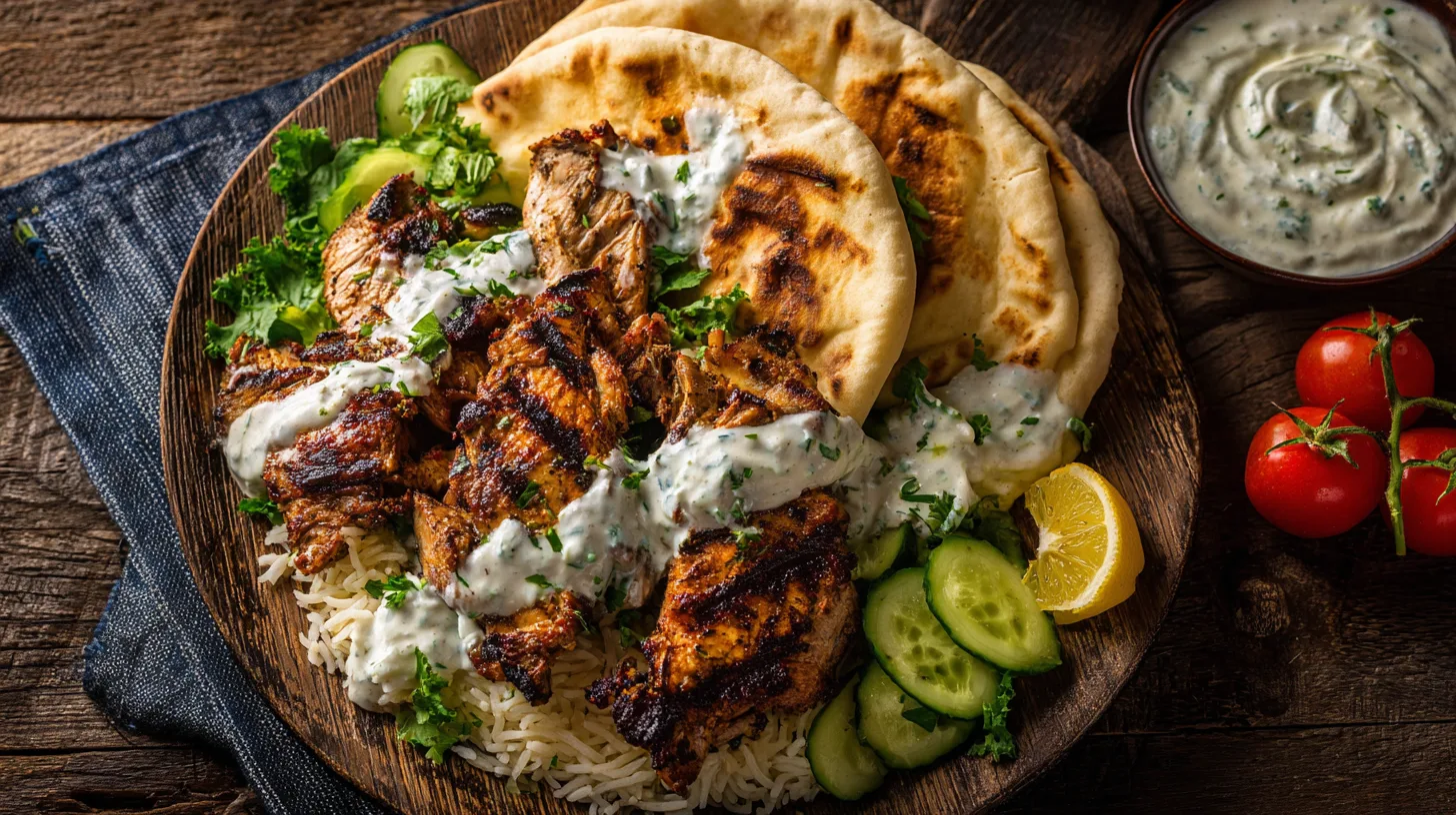 This protein-rich meal provides essential amino acids while the spice blend offers anti-inflammatory compounds from turmeric and antioxidants from paprika. The garlic sauce contributes heart-healthy compounds including allicin.
