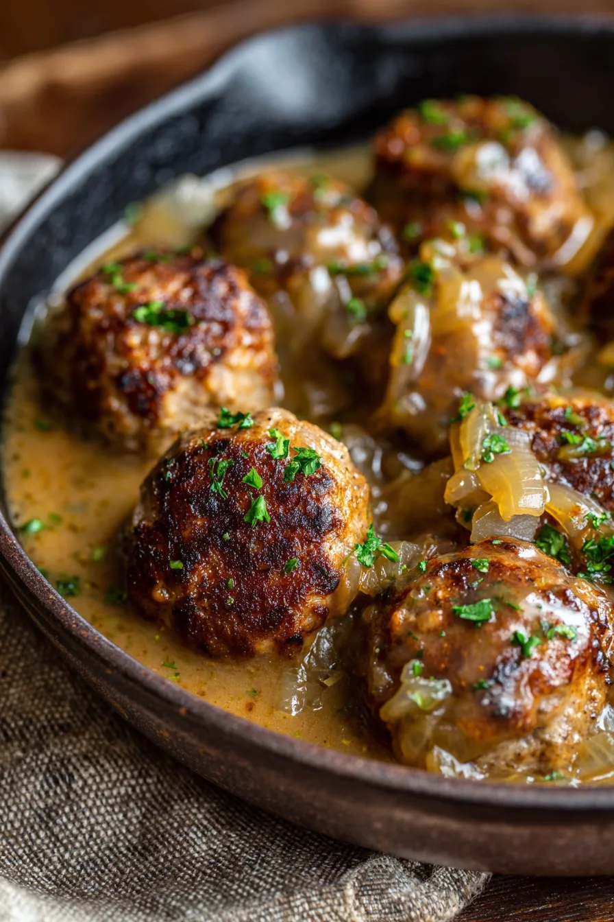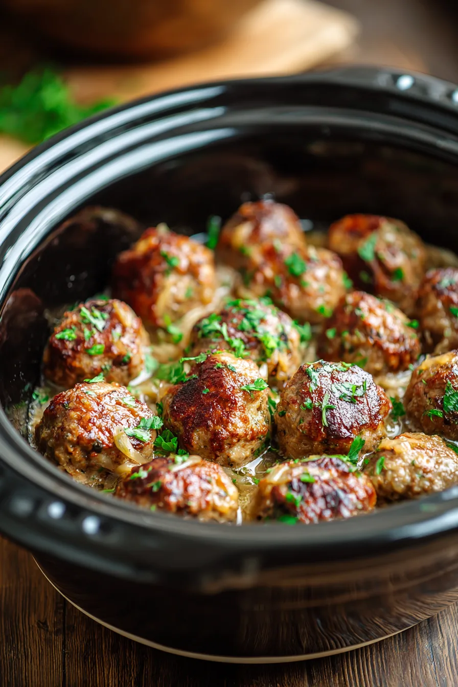 Cover and cook on LOW for 5-6 hours or HIGH for 3-4 hours. The meatballs are done when they reach an internal temperature of 165°F and the onions have melted into a rich, savory base that coats everything beautifully.