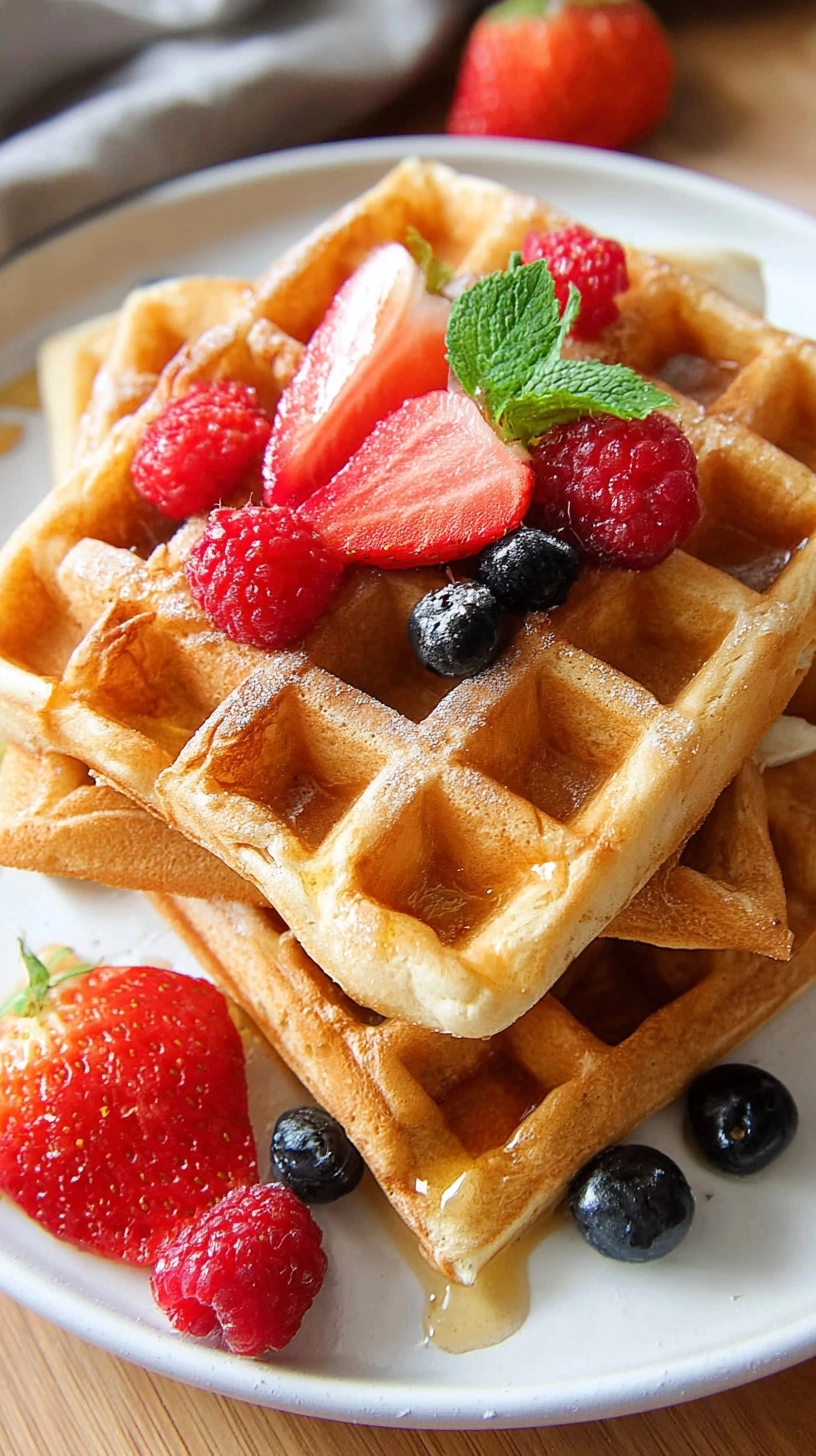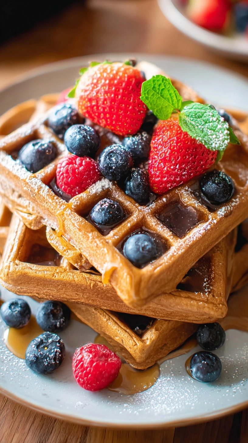 Lightly spray your preheated waffle iron with cooking spray and pour the appropriate amount of batter (typically ½ to ¾ cup depending on your iron size). Cook for 6-8 minutes until golden brown and crispy on the outside. Resist opening the iron too early – patience creates the perfect crispy exterior.