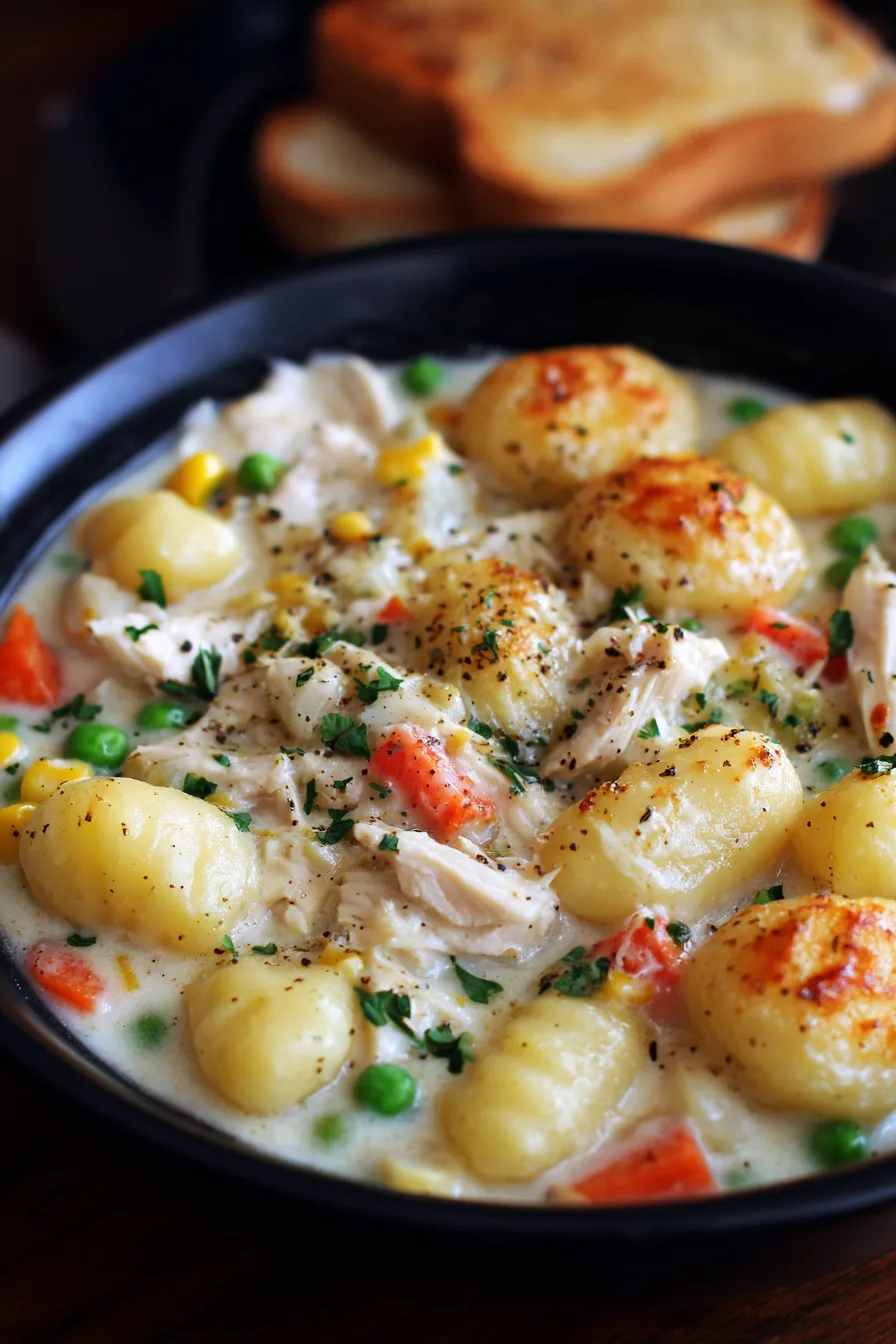 Return the seared chicken to the pot along with any accumulated juices. Add gnocchi, frozen peas, and corn. Gently stir to combine, then simmer for 8-10 minutes until gnocchi are tender and chicken is fully cooked through.