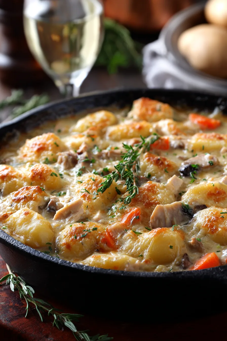 Serve this hearty One Pot Gnocchi Chicken Pot Pie in warmed bowls topped with freshly cracked black pepper and a sprinkle of fresh herbs. Pair with a crisp green salad dressed in lemon vinaigrette to cut through the richness, or serve alongside crusty sourdough bread for the ultimate comfort meal experience.