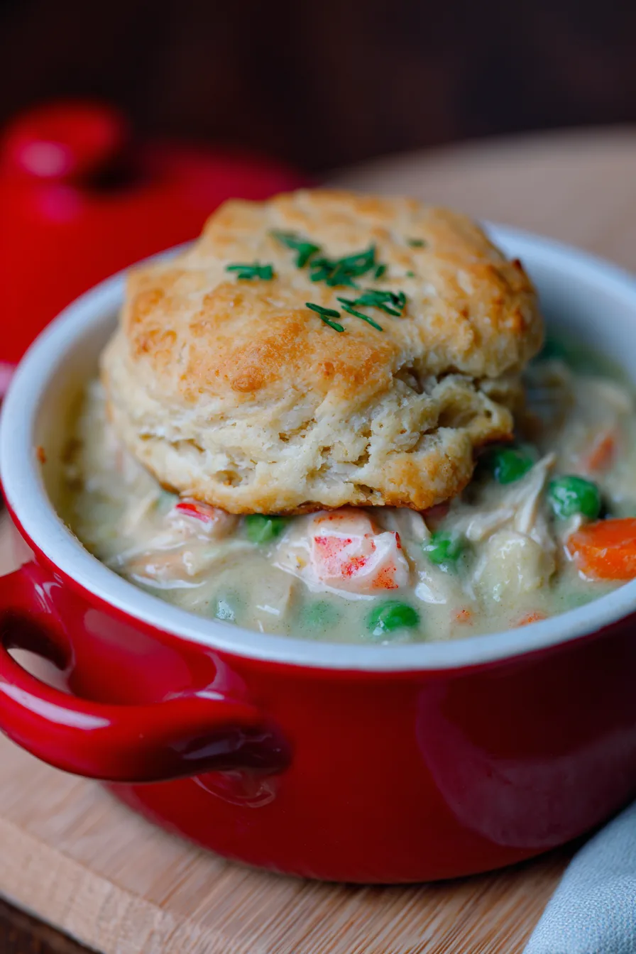 Refrigerate leftover red lobster biscuit chicken pot pie for up to 4 days in an airtight container. Reheat individual portions in a 350°F oven for 15-20 minutes to restore biscuit crispness—avoid microwaving, which makes biscuits soggy. For meal prep, prepare the filling up to 2 days ahead and refrigerate separately from unbaked biscuit topping. The assembled dish can be frozen for up to 3 months; thaw overnight in refrigerator before baking, adding an extra 10-15 minutes to cooking time.