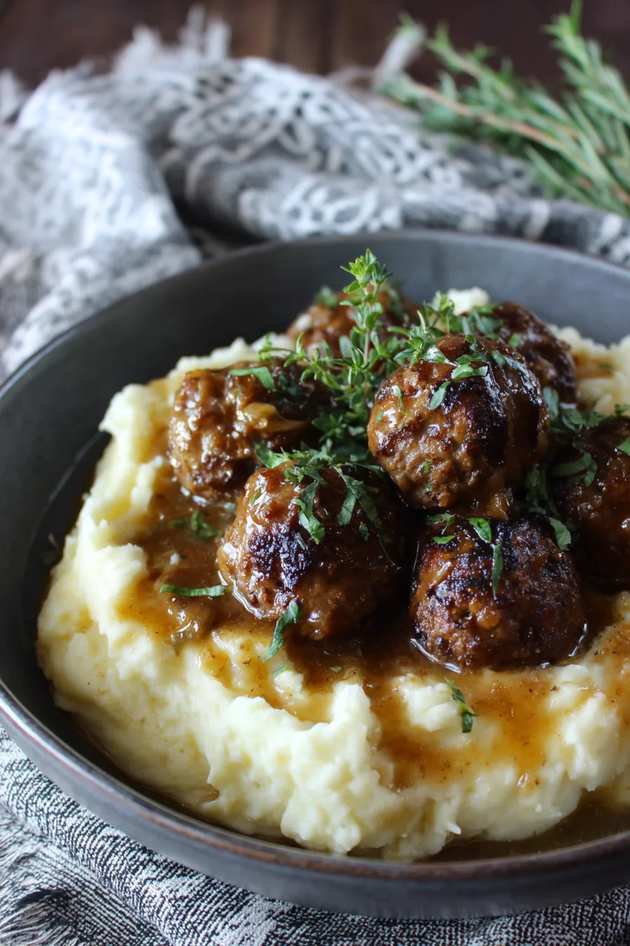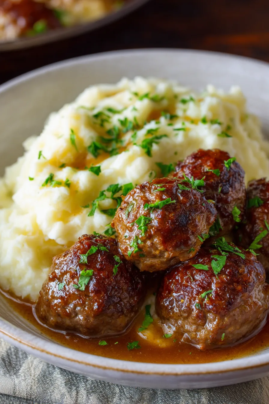 Present your Salisbury Steak Meatballs With Garlic Herb Mashed Potatoes family-style in a large, shallow bowl with meatballs nestled in rich gravy alongside a generous scoop of mashed potatoes. Garnish with fresh parsley and a sprinkle of paprika for visual appeal. Complement with steamed green beans, roasted Brussels sprouts, or a crisp garden salad. For special occasions, serve individual portions in warmed bowls with artisanal dinner rolls for an elevated presentation.