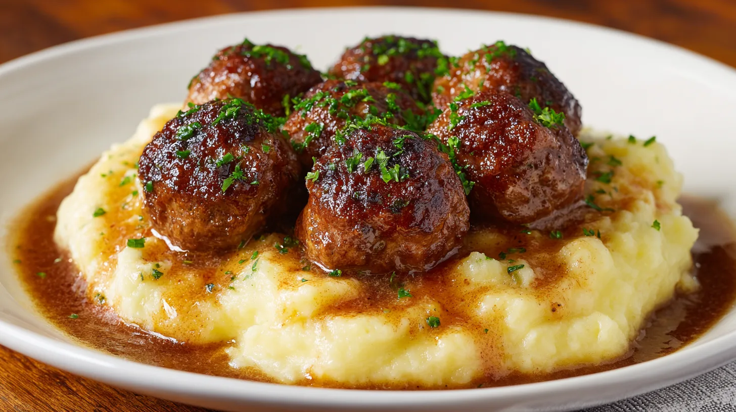 Each serving of Salisbury Steak Meatballs With Garlic Herb Mashed Potatoes provides approximately 485 calories, 28g protein, 35g carbohydrates, and 25g fat. The dish delivers 45% of daily iron requirements and 35% of potassium needs. The combination of lean protein and complex carbohydrates creates a balanced macronutrient profile that promotes satiety for 4-5 hours post-meal, according to nutritional studies on comfort food satisfaction.