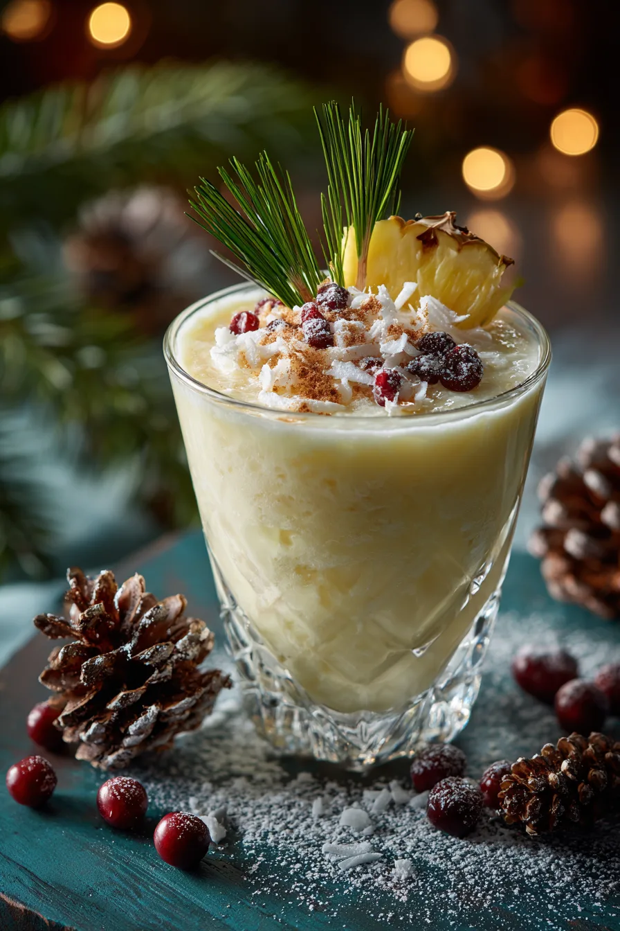 Pour your Virgin Christmas Colada into chilled hurricane glasses or large wine glasses, filling them ¾ full. Create an Instagram-worthy presentation by rimming glasses with toasted coconut flakes before pouring. Garnish each glass with a cinnamon stick, fresh pineapple wedge, and a maraschino cherry for that classic tropical-meets-Christmas aesthetic.