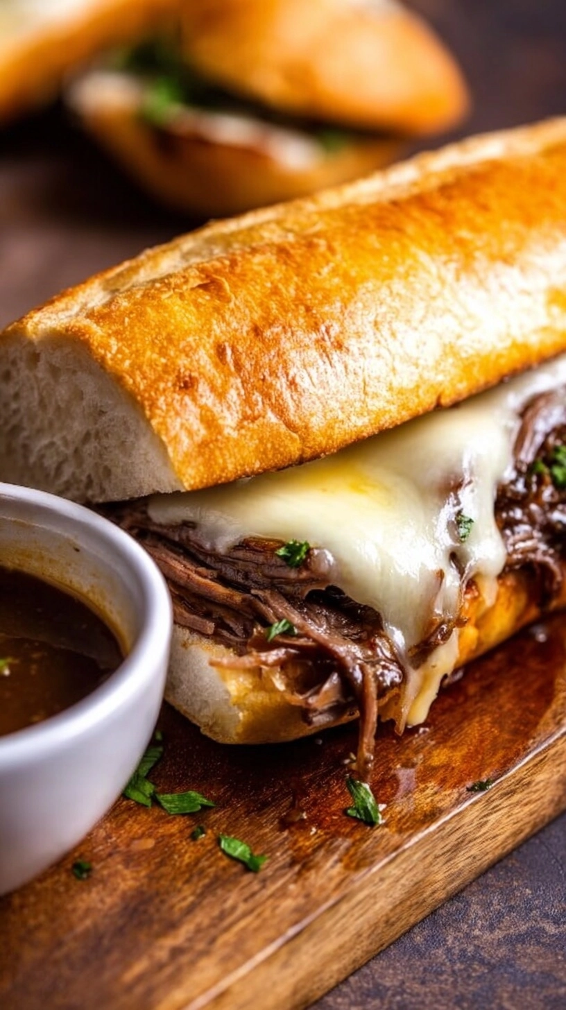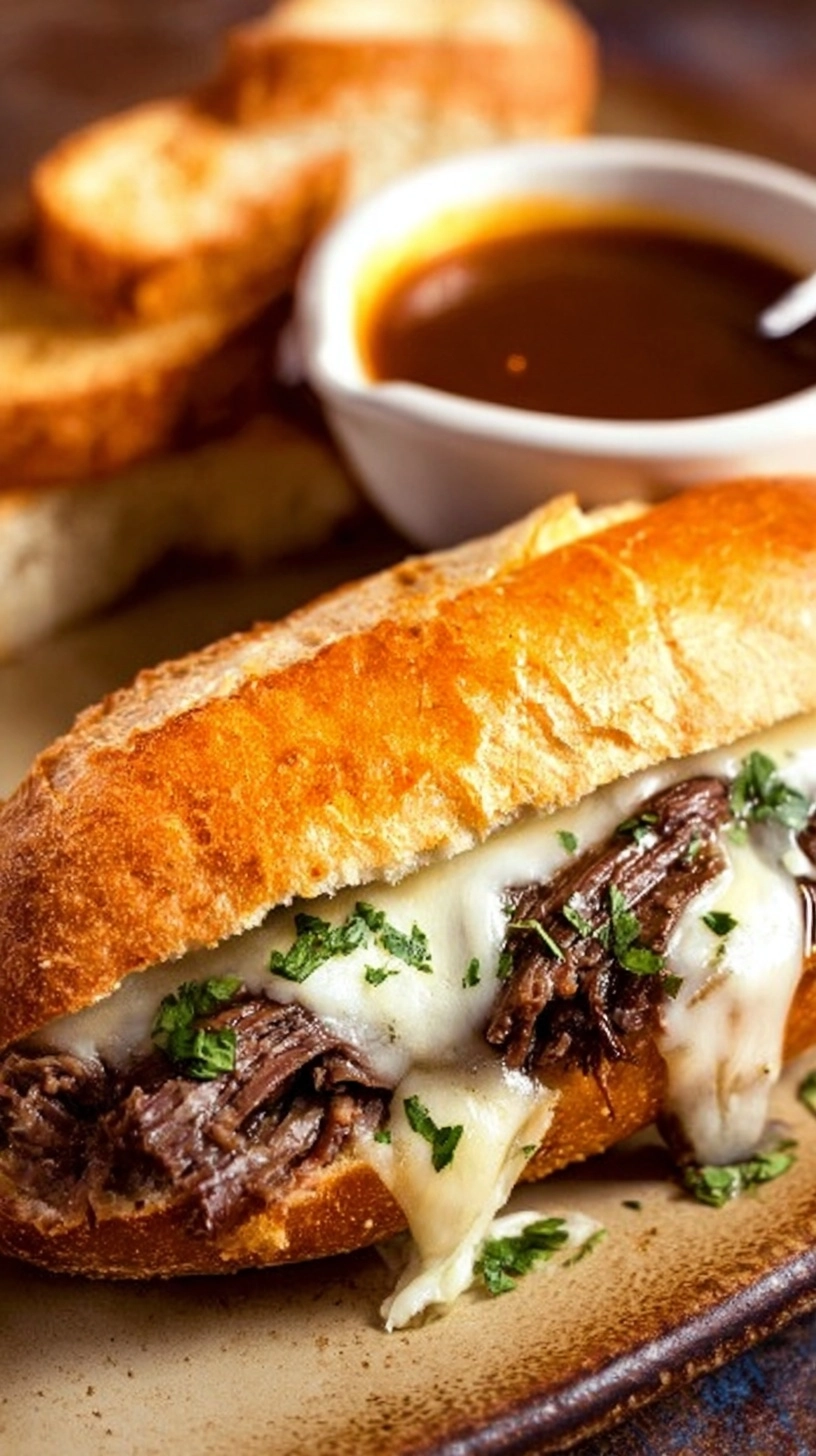 Cut sandwiches diagonally and serve with small bowls of the warm au jus for dipping. The contrast between the crispy exterior and melted interior creates the perfect textural experience.