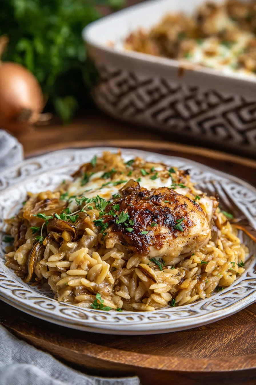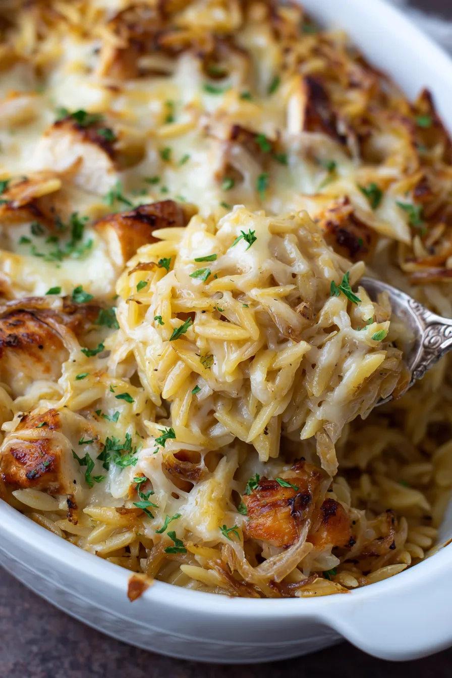 Elevate your French Onion Chicken Orzo Casserole presentation with these thoughtful accompaniments: serve alongside a crisp arugula salad with lemon vinaigrette to cut through the richness, or pair with roasted Brussels sprouts for textural contrast. Crusty sourdough bread makes an excellent vessel for savoring every last bit of the flavorful sauce. For elegant dinner parties, portion into individual ramekins before baking, creating restaurant-style presentations that impress guests while maintaining the homestyle comfort factor.