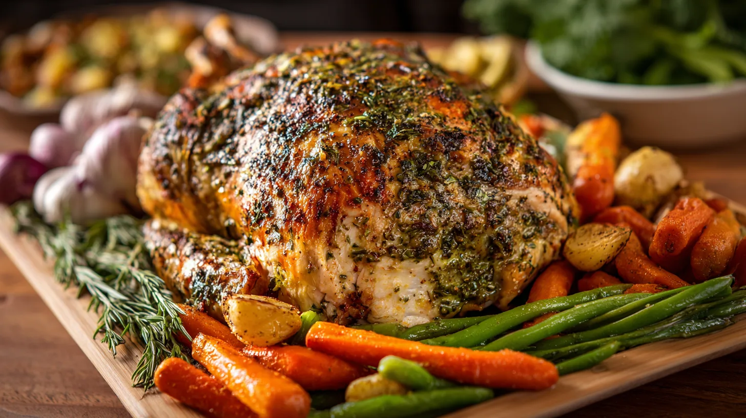 Present your Garlic Herb Butter Roast Turkey alongside roasted root vegetables that have absorbed the aromatic pan drippings. Create an elegant platter by surrounding sliced turkey with colorful roasted Brussels sprouts, honey-glazed carrots, and herb-roasted fingerling potatoes.