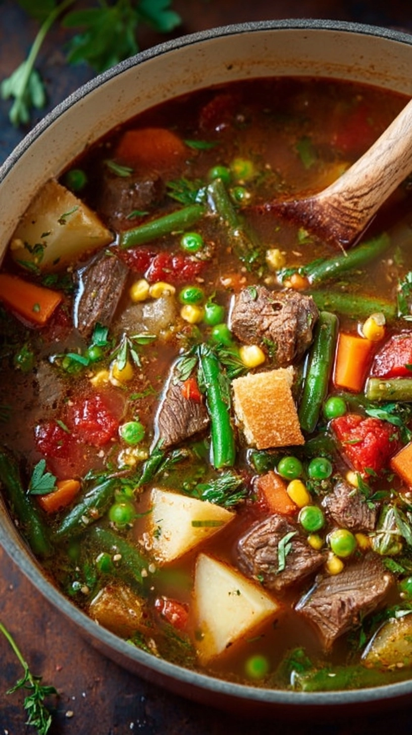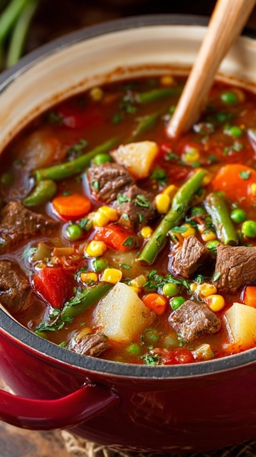 Serve this hearty vegetable beef soup with warm, crusty sourdough bread or homemade cornbread for dipping. For elegant presentation, garnish with fresh chopped parsley and a drizzle of high-quality olive oil. Consider serving alongside a crisp green salad with vinaigrette to balance the soup’s richness. For family gatherings, set up a toppings bar with shredded cheese, sour cream, and fresh herbs, allowing each person to customize their bowl.