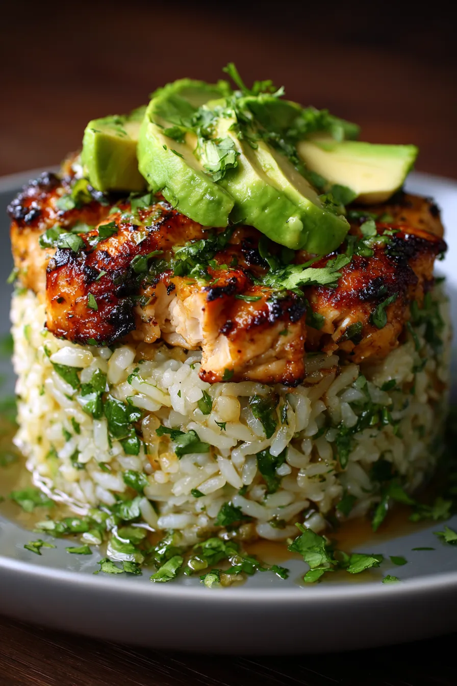Slice chicken into thick diagonal cuts. Using a round mold or clean can, layer cilantro lime rice as the base, top with seasoned avocado mixture, and crown with sliced honey lime chicken. Drizzle with remaining glaze.