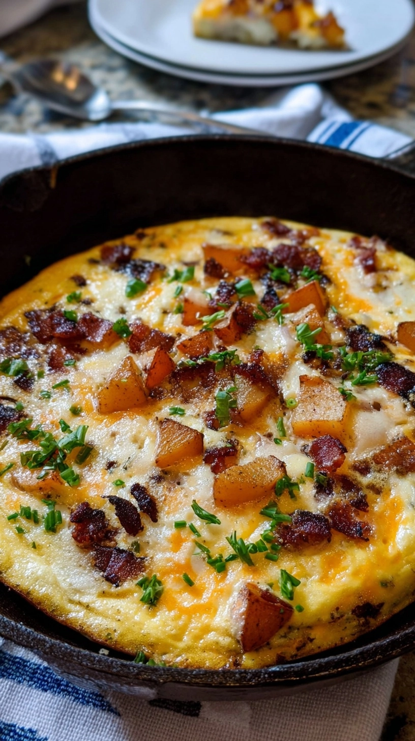 Pour the egg mixture over the bacon-potato base, ensuring even distribution. Sprinkle grated Gruyère cheese evenly across the surface. Transfer the skillet immediately to the preheated oven and bake for 18-20 minutes, until the center is just set and the top displays a beautiful golden hue.