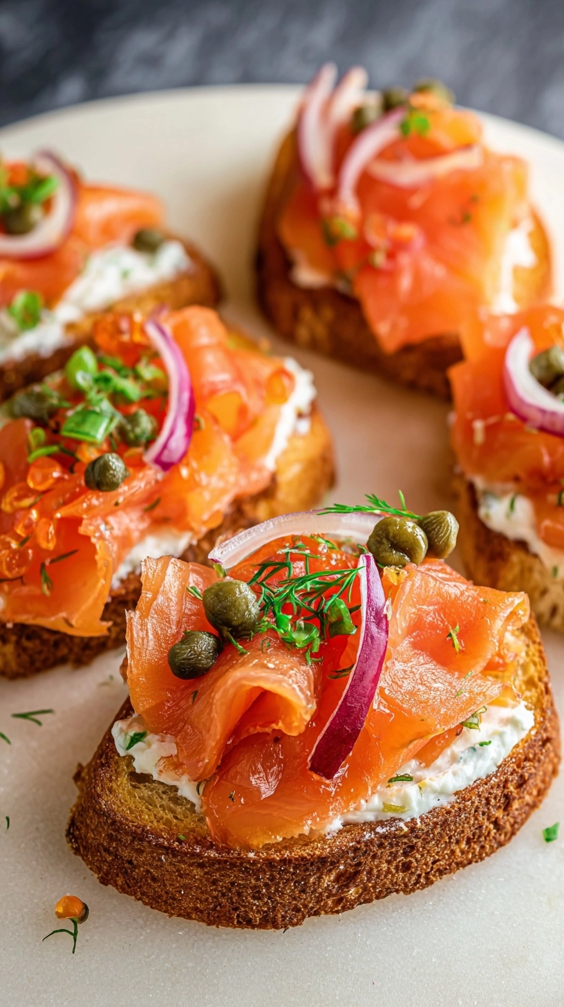 Present your irresistible smoked salmon bruschetta on a marble serving board alongside complementary items like fresh berries, mixed olives, and artisanal crackers. For brunch gatherings, pair with freshly squeezed orange juice or herbal teas. During evening events, these pair beautifully with sparkling water infused with cucumber and mint. Consider creating a DIY bruschetta bar where guests can customize their own combinations.