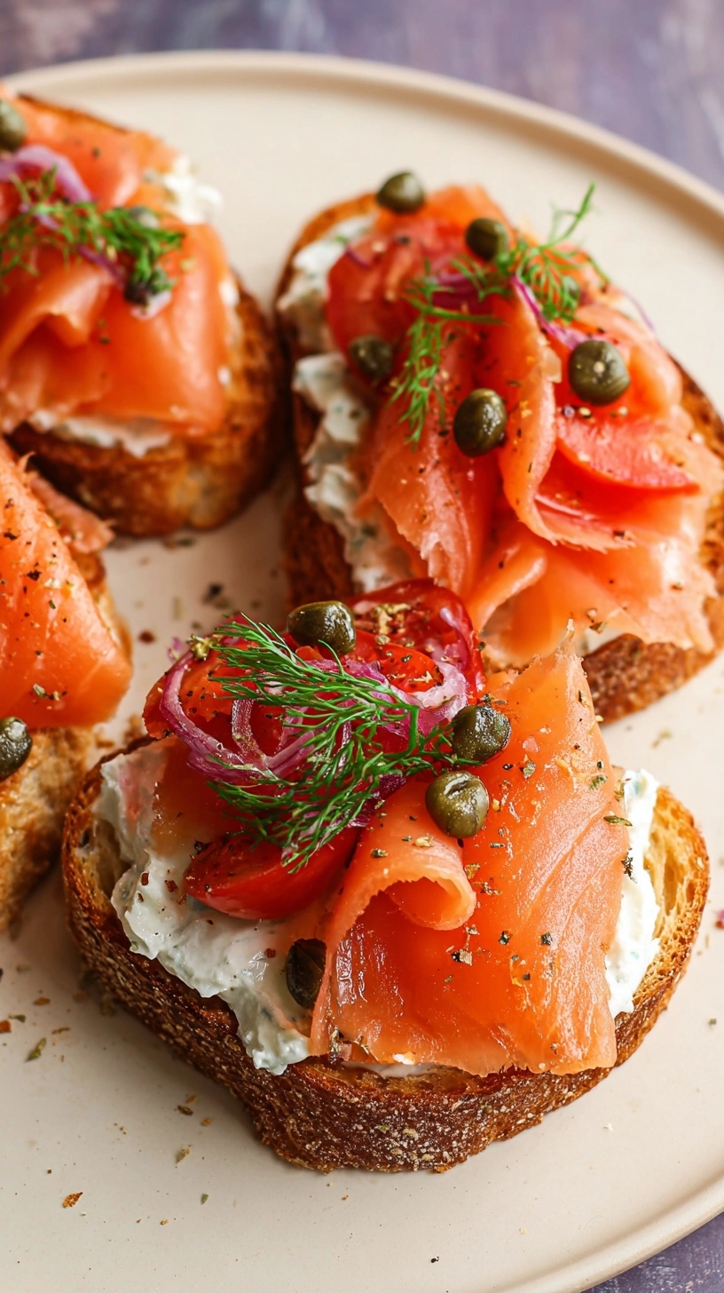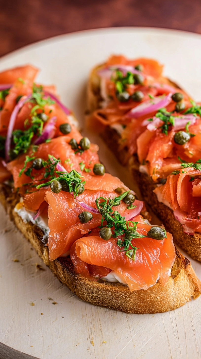 Present your irresistible smoked salmon bruschetta on a marble or wooden board alongside fresh lemon wedges and additional capers. Pair with sparkling water infused with cucumber and mint, or serve as part of a Mediterranean mezze platter including olives, fresh fruits, and artisanal cheeses. For brunch gatherings, accompany with champagne flutes filled with sparkling apple cider for an alcohol-free celebratory touch.