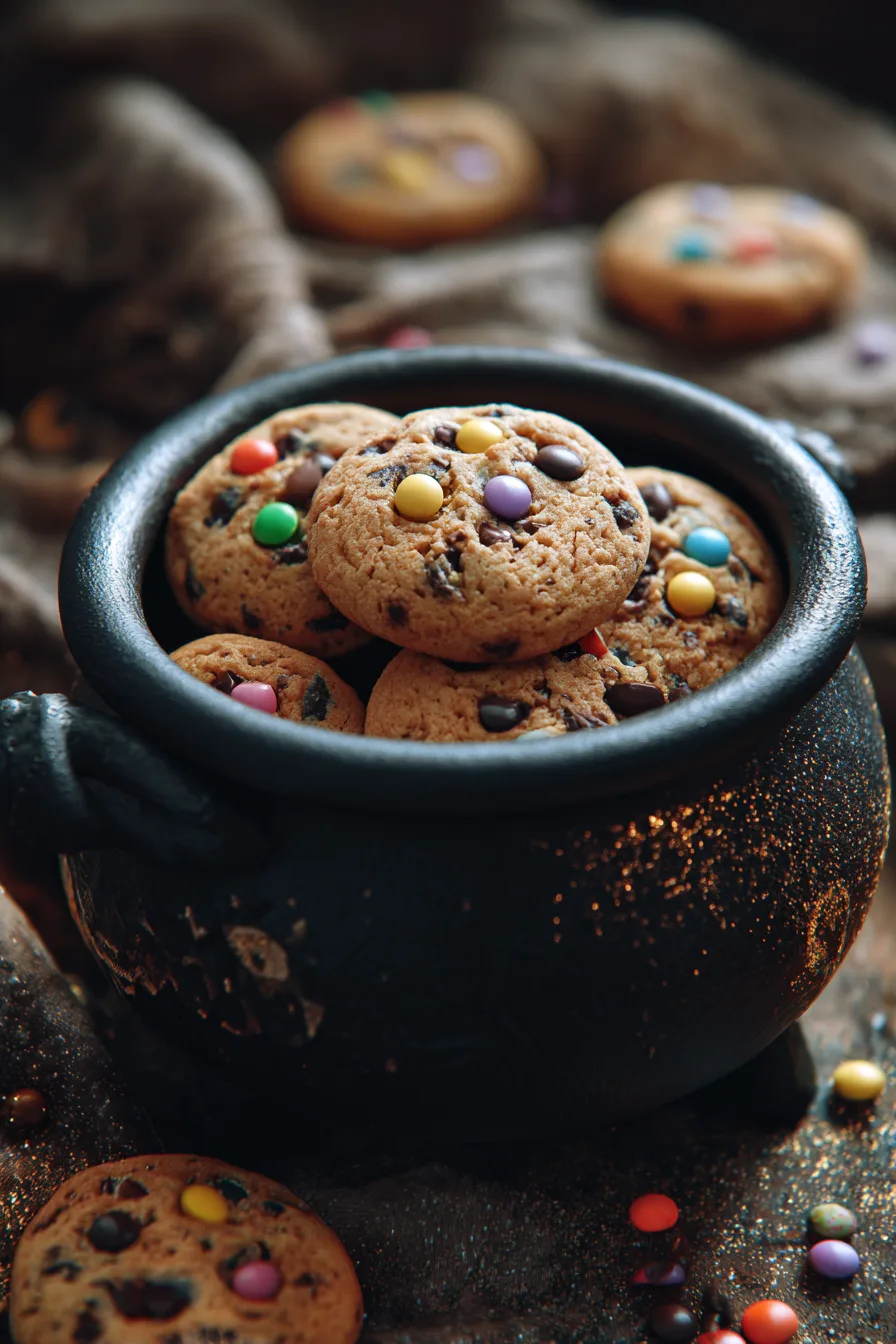 Store completed cauldron cookies in airtight containers at room temperature for up to one week, placing parchment paper between layers to prevent sticking. The cookie dough can be prepared up to three days in advance and refrigerated, or frozen for up to three months. For optimal freshness, add the “bubbling” toppings just before serving to maintain visual appeal and texture contrast.