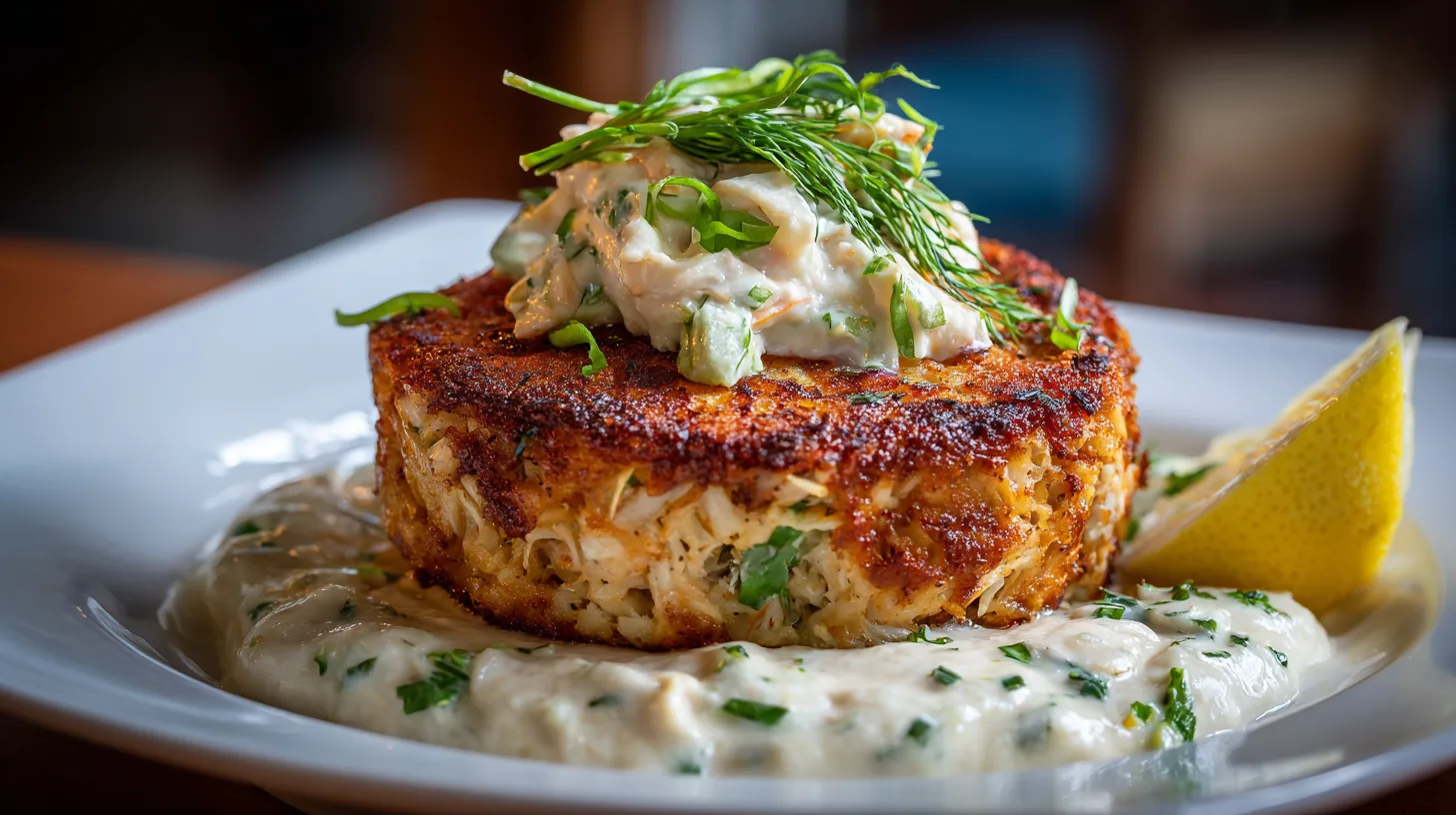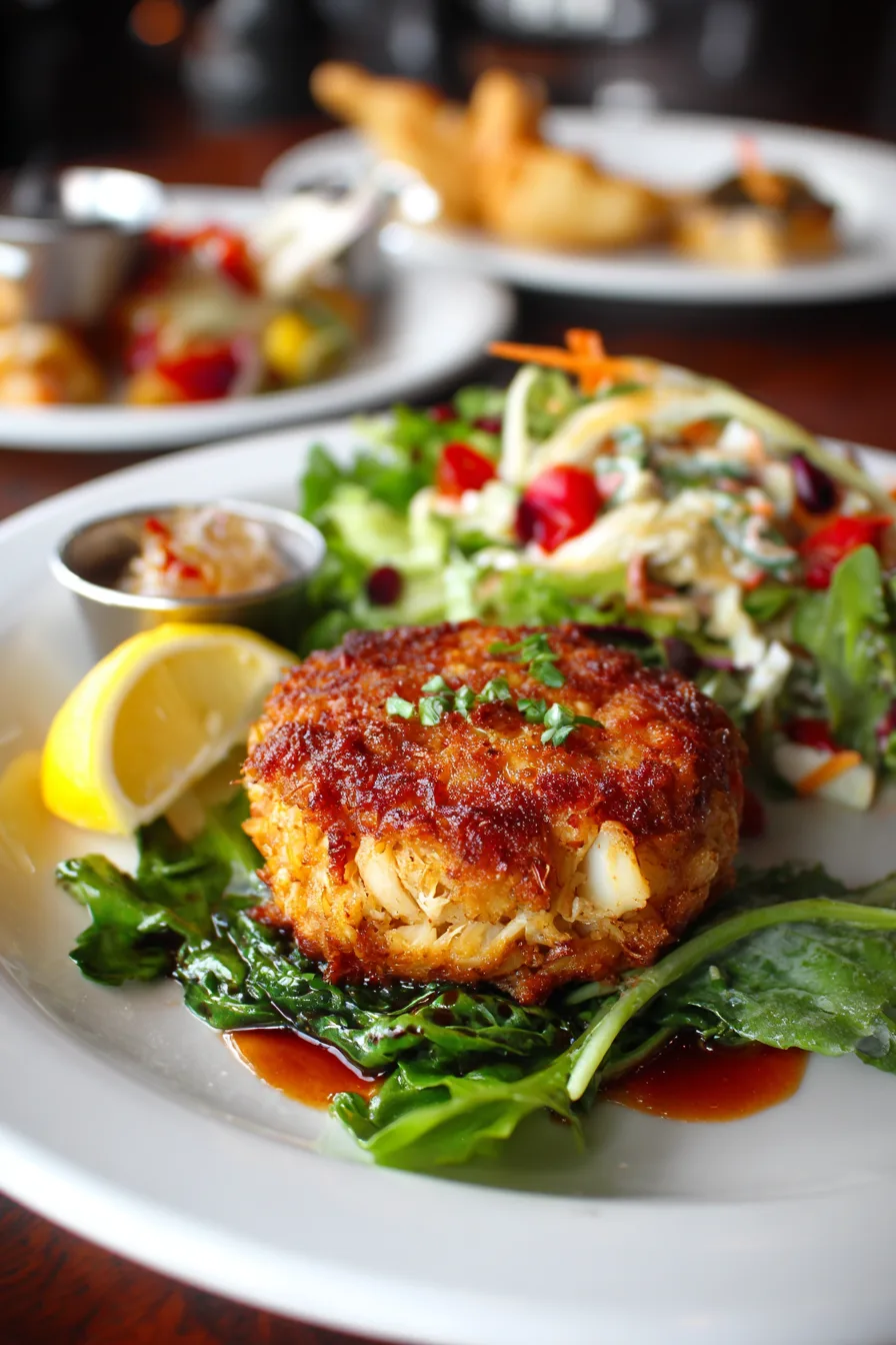 Maryland style crab cakes use minimal filler and no bell peppers or onions, allowing pure crab flavor to dominate, unlike Charleston or California variations.