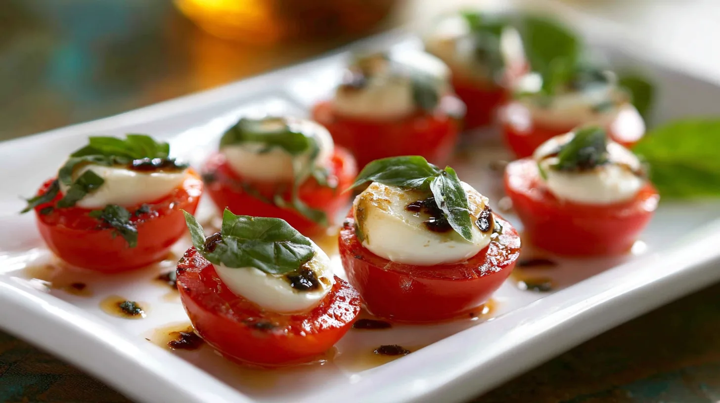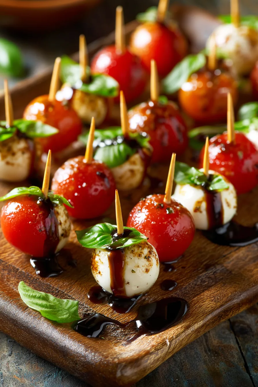 Drizzle each bite with the cooled balsamic glaze, add a light brush of olive oil, and finish with sea salt flakes and cracked pepper. The contrast between sweet glaze, peppery basil, and salty cheese creates the perfect flavor symphony in each bite.