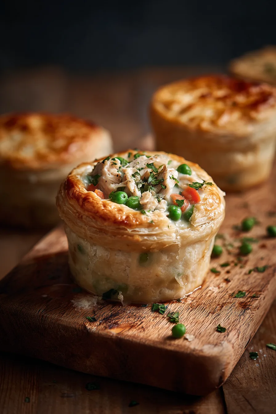 These mini chicken pot pies shine as elegant individual entrees for dinner parties or cozy family meals. Pair them with a crisp arugula salad dressed with lemon vinaigrette to cut through the richness. For autumn gatherings, serve alongside roasted Brussels sprouts or honey-glazed carrots.