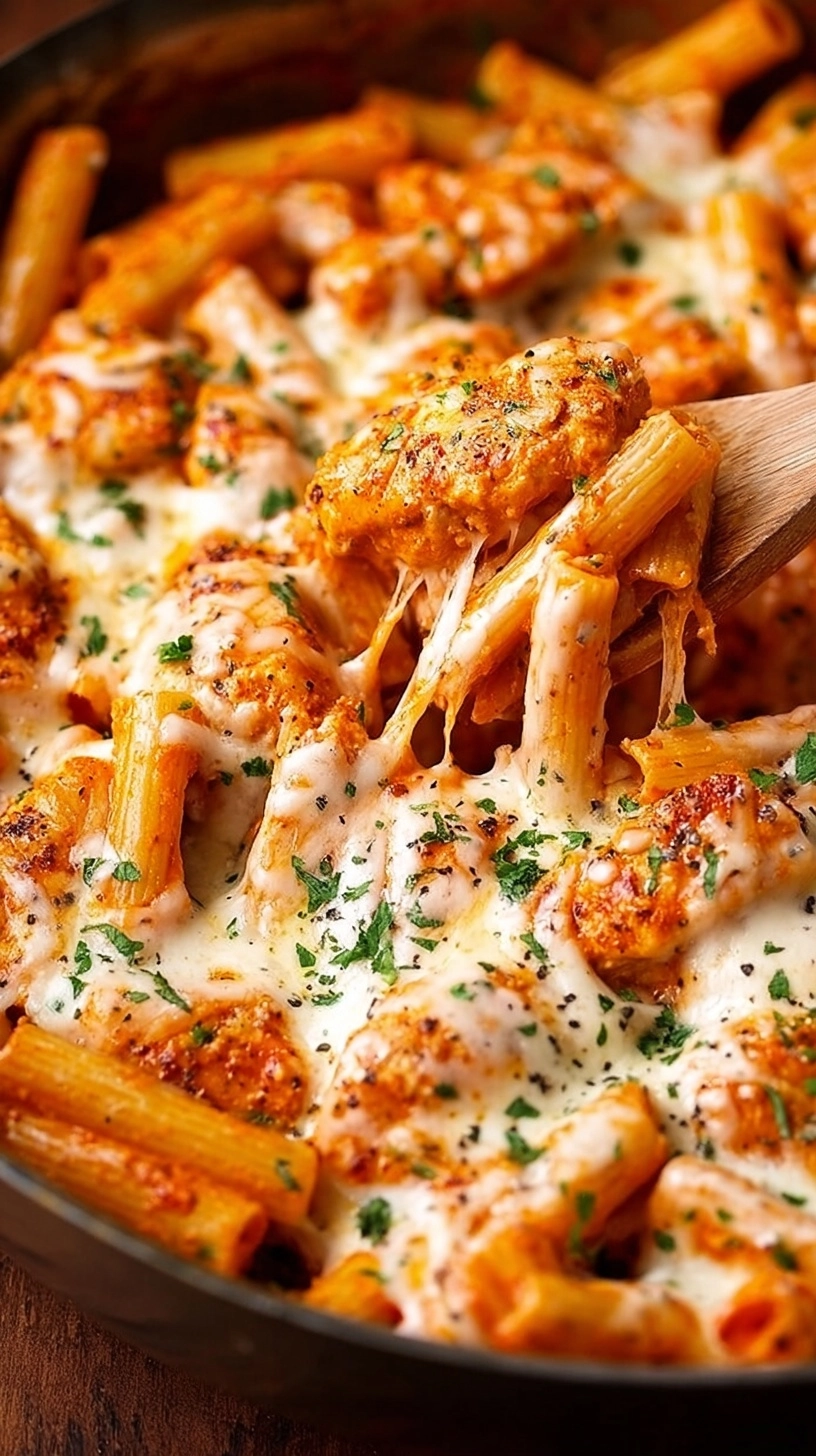 Nestle the seared chicken pieces back into the pot, gently stirring to distribute evenly throughout the pasta. Sprinkle the remaining Parmesan cheese and mozzarella over the top, cover, and let stand for 3-4 minutes to allow cheese to melt into gooey perfection. Finish with fresh basil and oregano for a burst of herbaceous brightness.