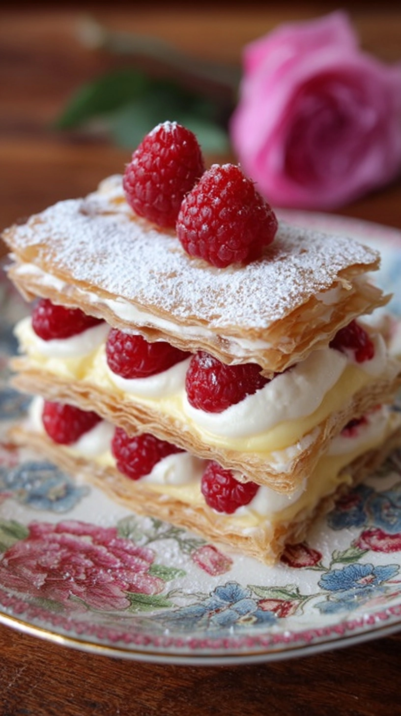 Present your Raspberry Cream Napoleons on chilled dessert plates with a delicate dusting of powdered sugar and fresh mint garnish. Pair with freshly brewed espresso or Earl Grey tea to complement the vanilla and raspberry flavors. For an elegant Valentine’s presentation, create heart-shaped raspberry coulis drizzles around each plate and add candied rose petals. These napoleons also shine as part of a dessert buffet alongside chocolate-covered strawberries and champagne flutes filled with sparkling grape juice.