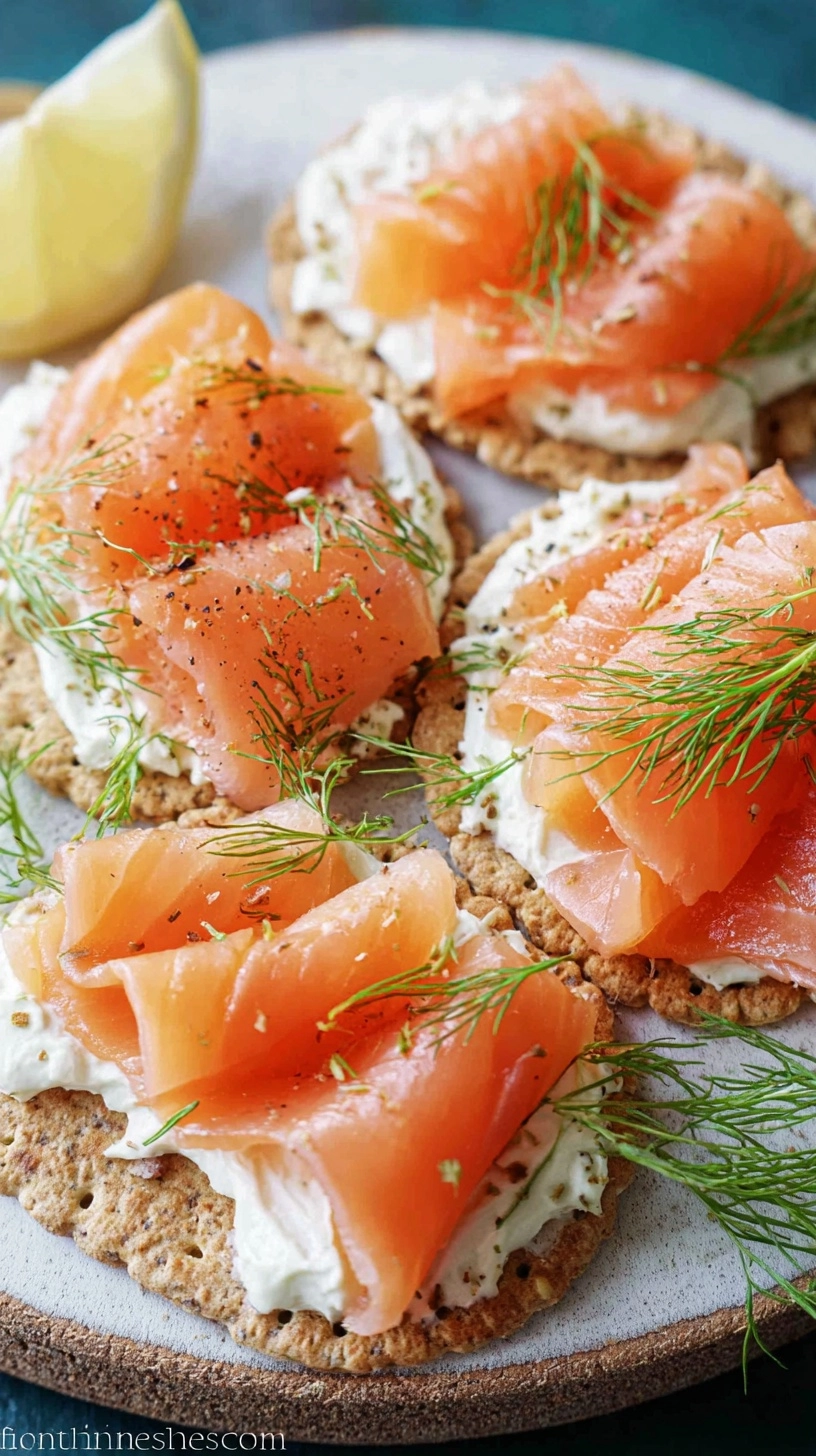 Layout crackers on serving platters, ensuring they’re completely dry. Organize ingredients in small bowls for efficient assembly: cream cheese mixture, salmon pieces, capers, onion slices, and fresh herbs. This mise en place approach reduces assembly time by 40% and ensures consistent presentation.