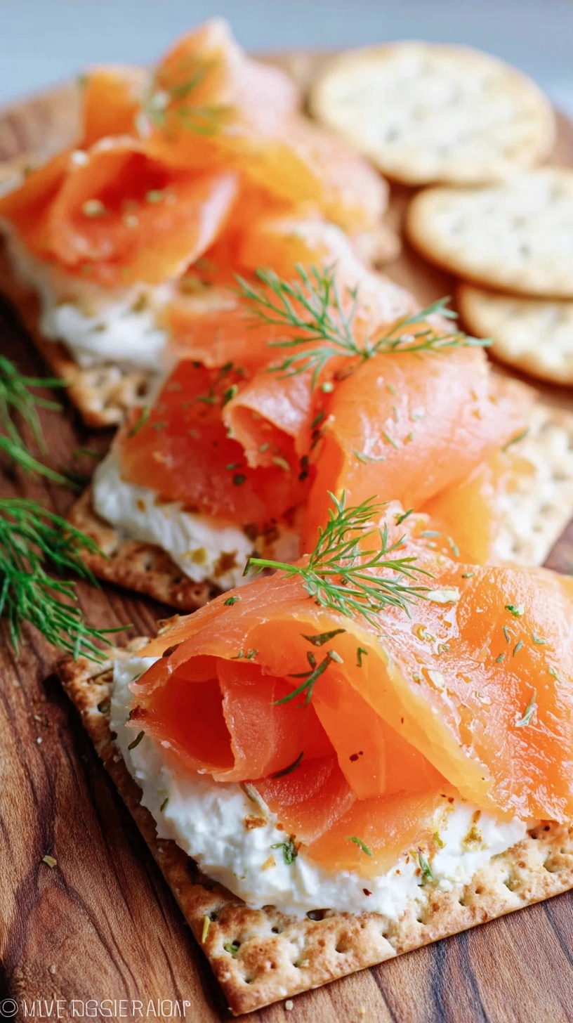 Present these smoked salmon cream cheese crackers as part of an elevated appetizer spread alongside complementary flavors. Pair with crisp cucumber rounds topped with herbed goat cheese, or create a “Nordic board” featuring pickled vegetables, dark bread, and additional smoked fish varieties.