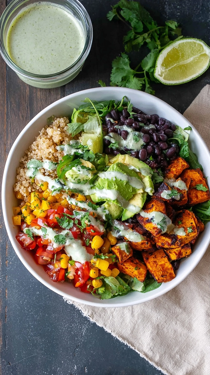 Start with a generous scoop of warm quinoa as your base. Layer on the seasoned black bean mixture, followed by the golden roasted sweet potatoes. Arrange colorful toppings – corn, shredded cabbage, avocado slices – in appealing sections around the bowl.