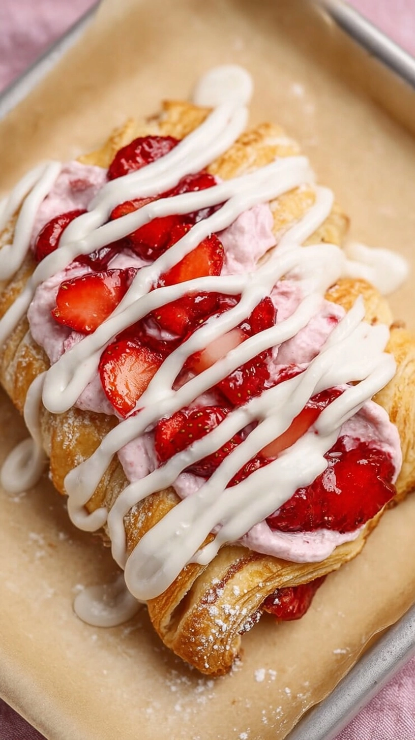 Roll risen dough into a 12×16 inch rectangle. Cut into 8 equal squares. Place 2 tablespoons of strawberry cream in the center of each square. Fold corners toward the center, creating an envelope shape, and pinch edges to seal securely.