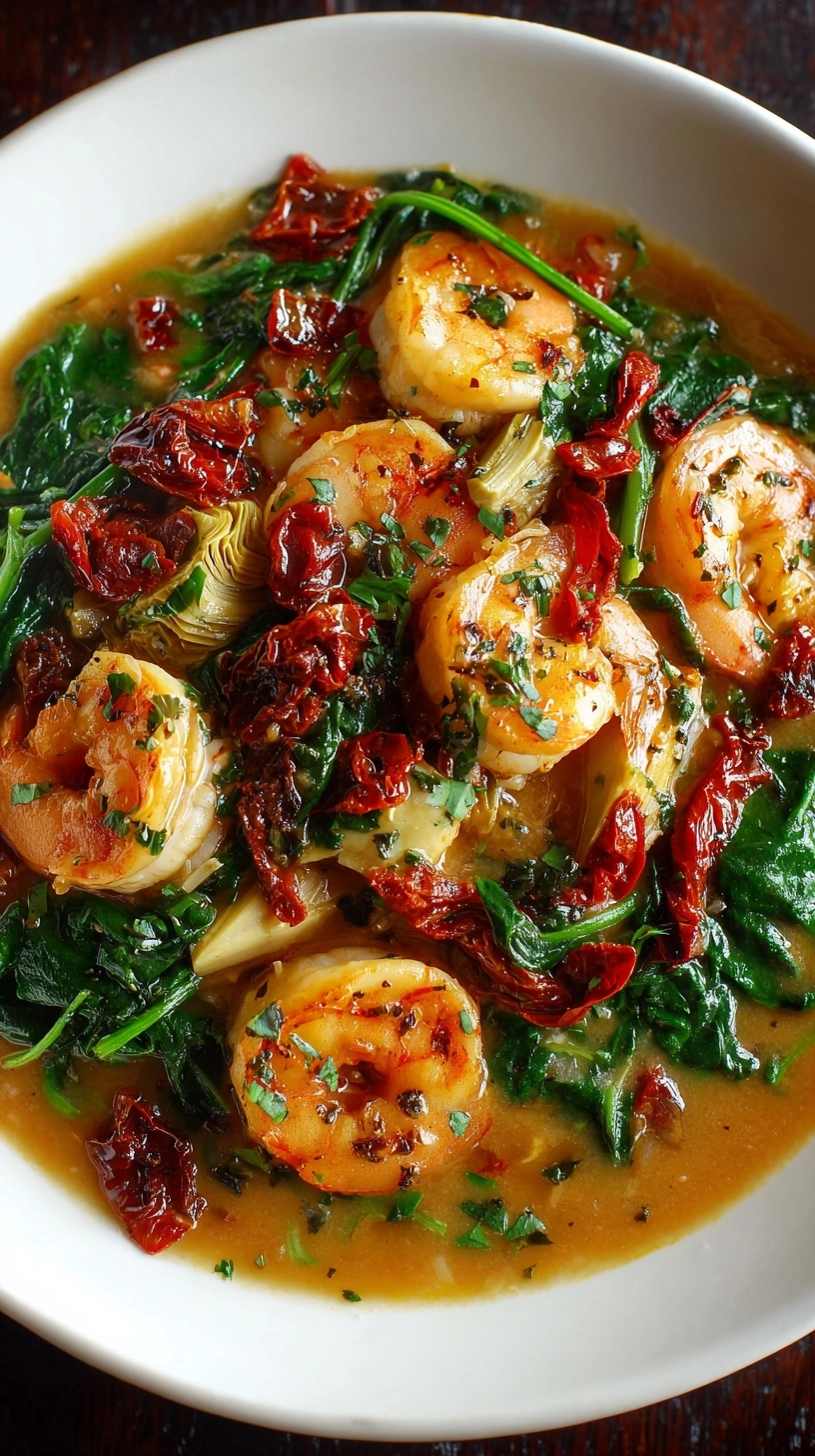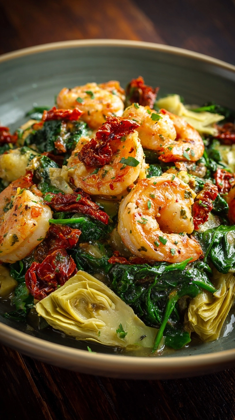 Serve this elegant Tuscan Shrimp with Spinach, Artichokes, Sun-Dried Tomatoes over al dente pasta in warmed bowls to maintain optimal temperature. Accompany with crusty sourdough bread for sauce absorption and a simple arugula salad dressed with lemon vinaigrette. For entertaining, present family-style in a large serving bowl garnished with fresh basil and extra Parmesan. Consider pairing with roasted asparagus or grilled zucchini to enhance the Mediterranean theme while adding colorful visual appeal.